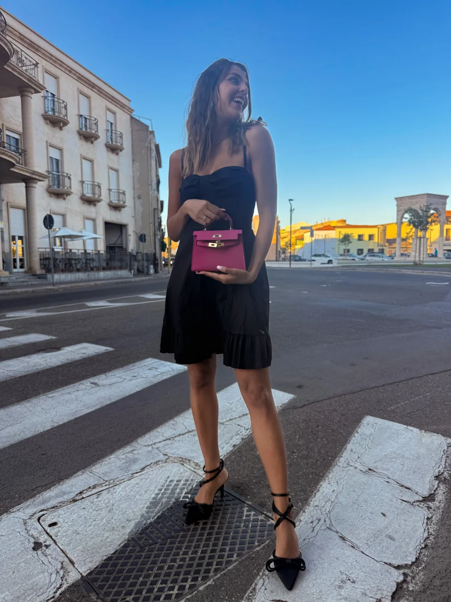 Abito corto dallo stile femminile e fresco, caratterizzato da un corpino strutturato con coppe sagomate e spalline sottili, di cui una annodata per un dettaglio romantico. Il bustino è aderente e valorizzato da cuciture verticali che donano definizione alla silhouette. Il retro presenta una fascia smock elasticizzata che garantisce comfort e vestibilità. La gonna si […]