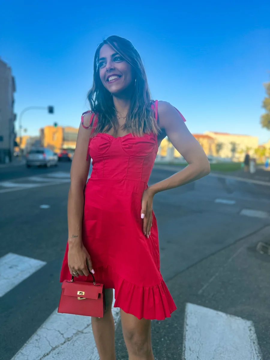 Abito corto dallo stile femminile e fresco, caratterizzato da un corpino strutturato con coppe sagomate e spalline sottili, di cui una annodata per un dettaglio romantico. Il bustino è aderente e valorizzato da cuciture verticali che donano definizione alla silhouette. Il retro presenta una fascia smock elasticizzata che garantisce comfort e vestibilità. La gonna si apre morbida, leggermente svasata, e termina con una balza arricciata che aggiunge movimento e un tocco giocoso. Ideale per look estivi e casual chic.
