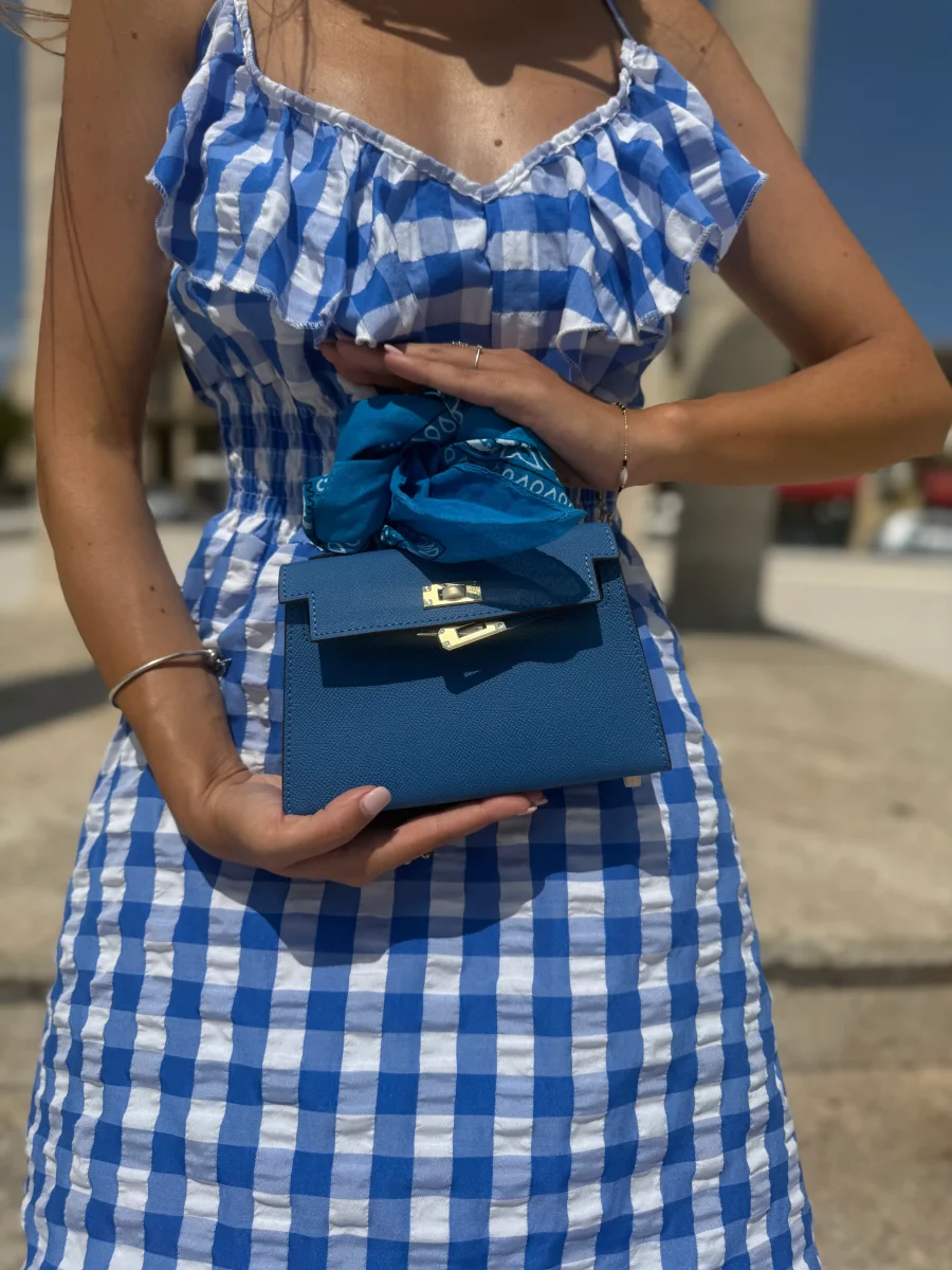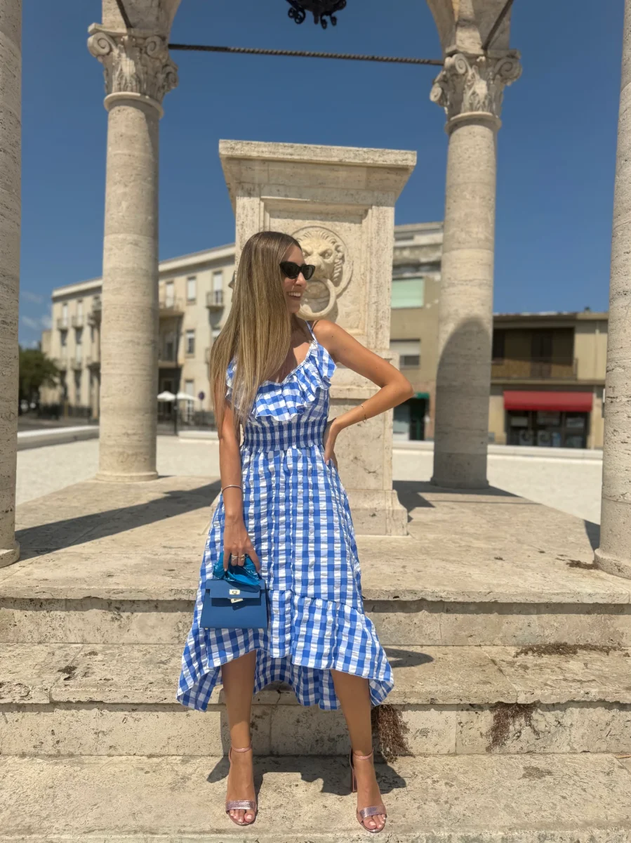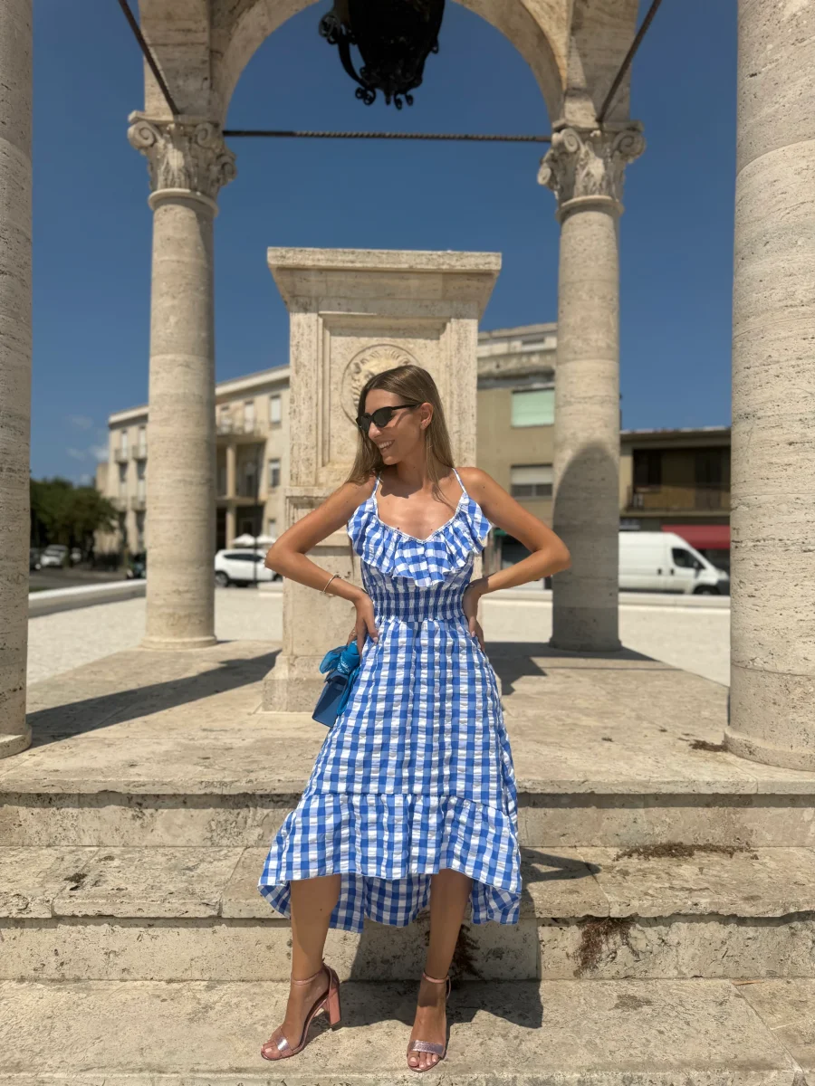 Abito midi a quadretti dallo stile fresco e spensierato, perfetto per l’estate. Il modello presenta una scollatura con volant e sottili spalline regolabili, mentre il corpetto è elasticizzato per garantire una vestibilità confortevole e aderente. La gonna ampia e svasata ha un taglio asimmetrico con balza sul fondo, che dona movimento e leggerezza alla silhouette. Un capo romantico e giocoso, ideale per le giornate di sole o per un look da vacanza.