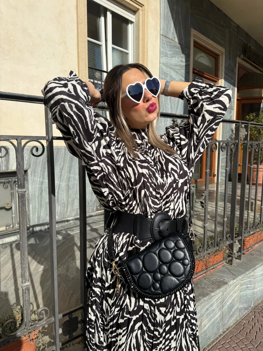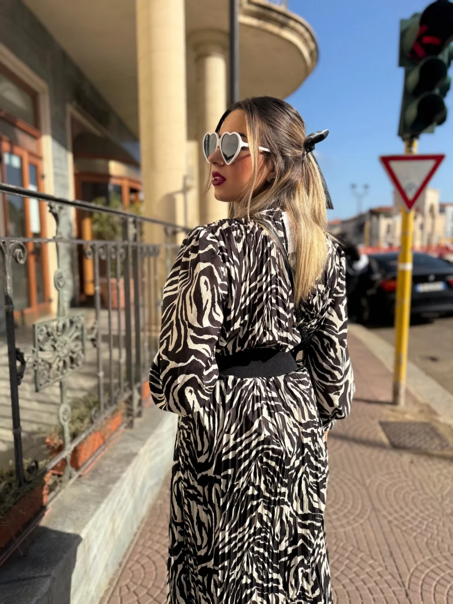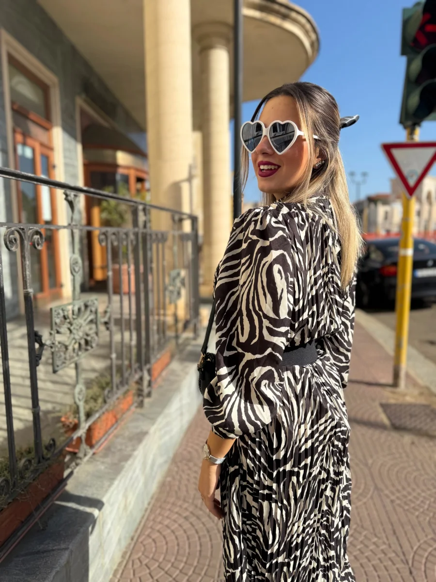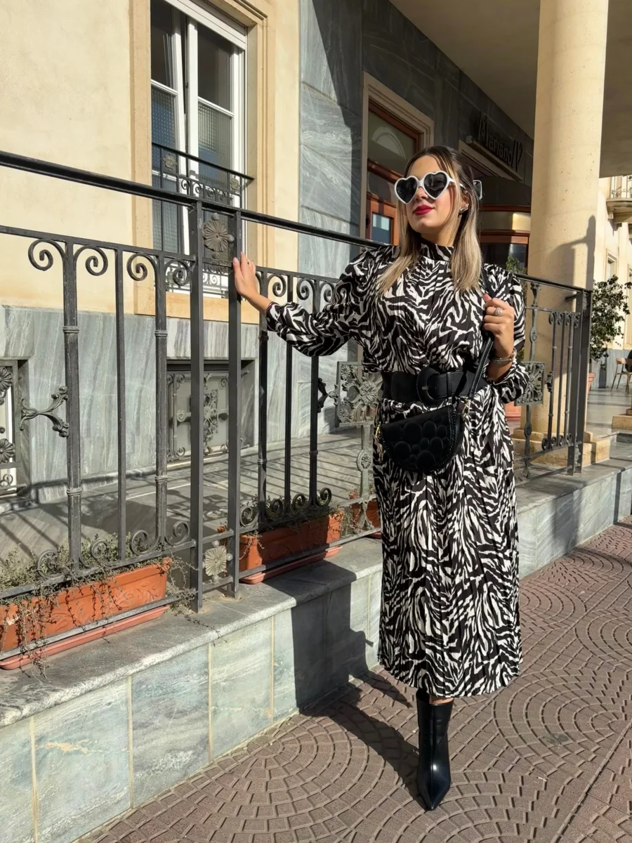 L’abito è lungo e caratterizzato da una stampa zebrata in bianco e nero. Ha una vestibilità fluida, con maniche lunghe e un taglio leggermente ampio. L’outfit è abbinato a una cintura nera indossata in vita per accentuare la silhouette. Il look che avrai sarà elegante e moderno, perfetto per una giornata di sole.