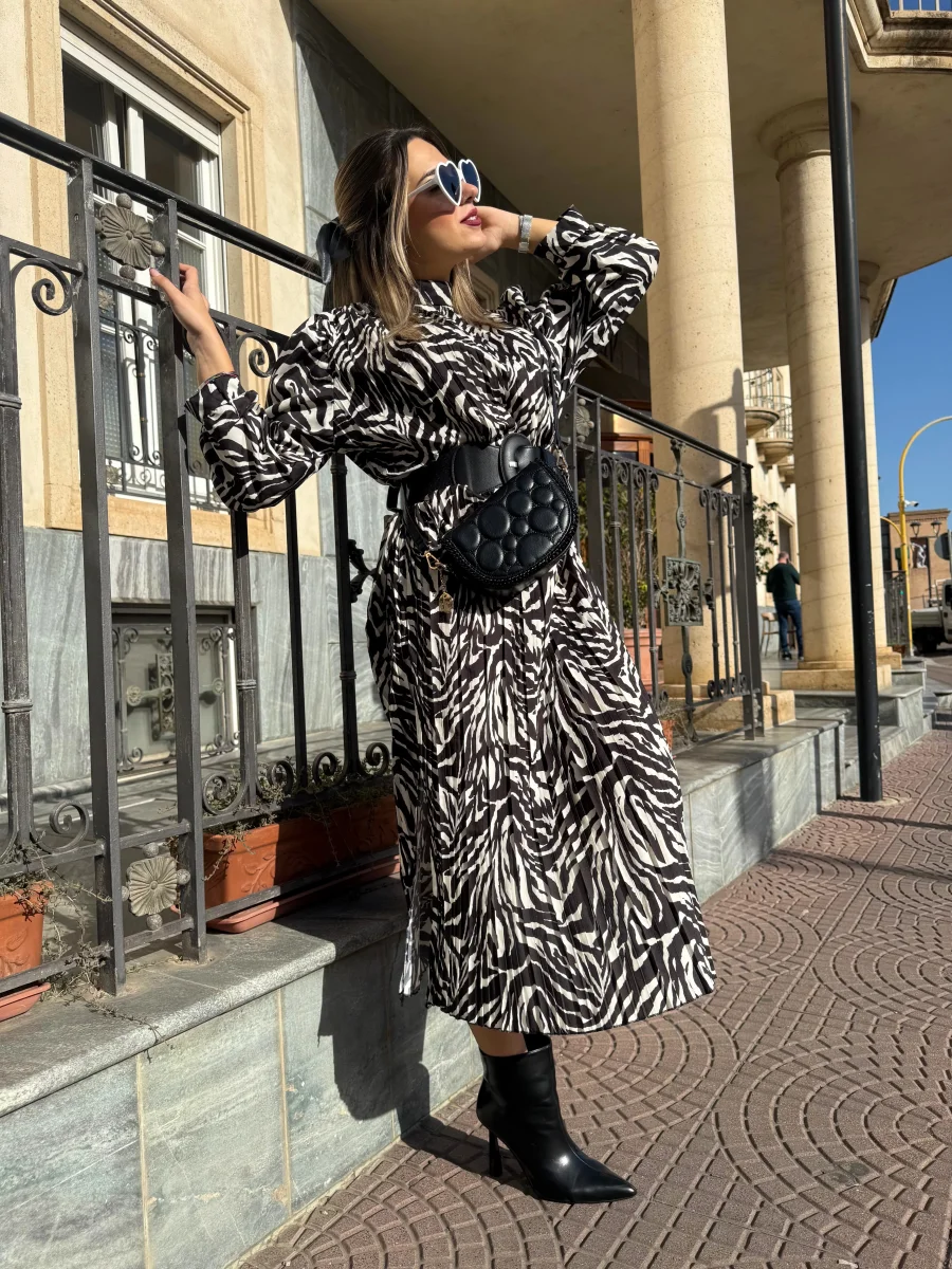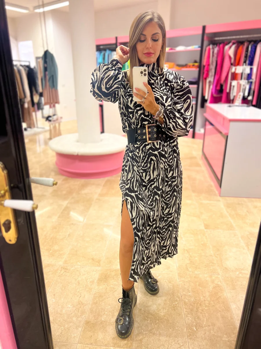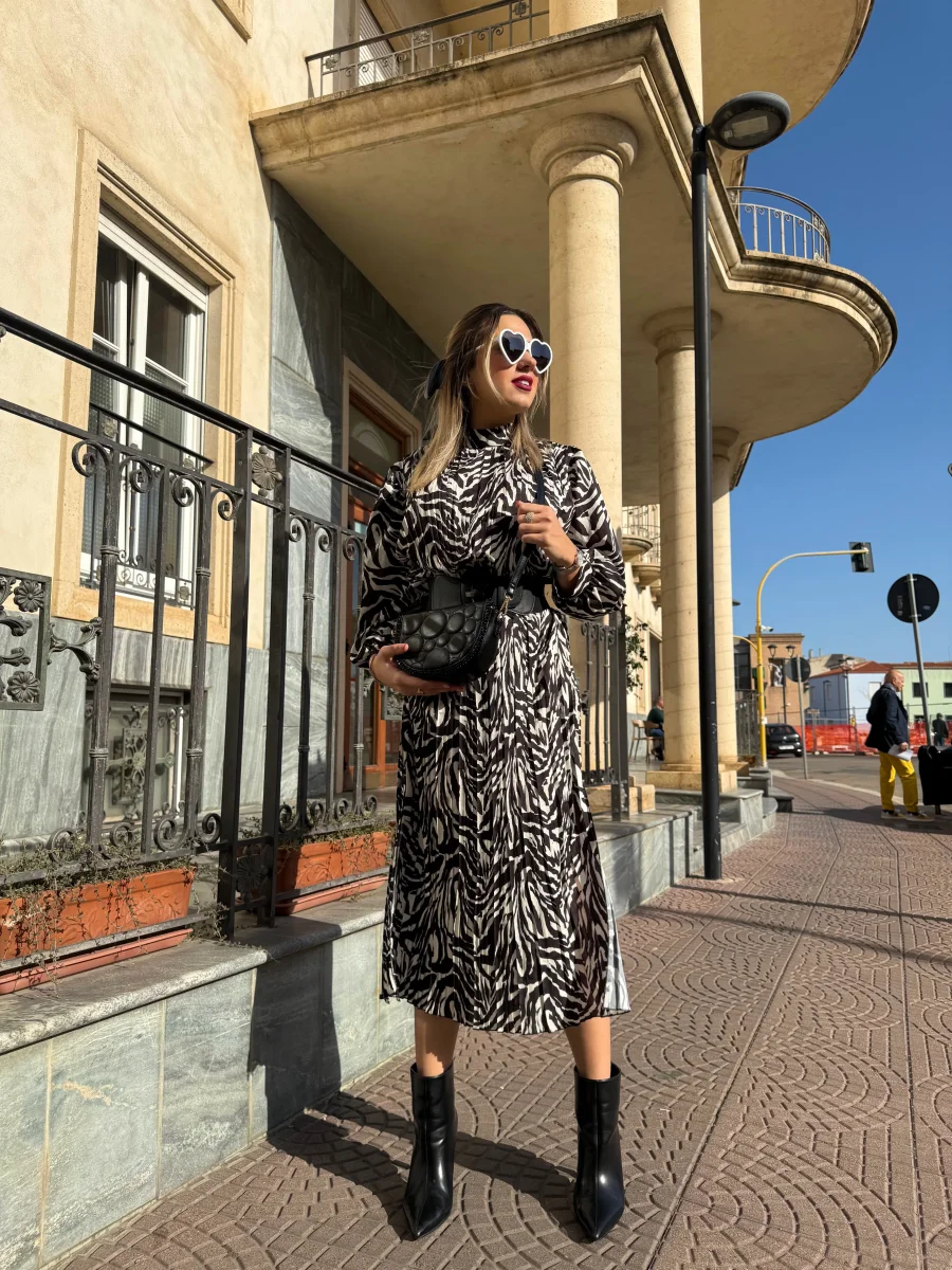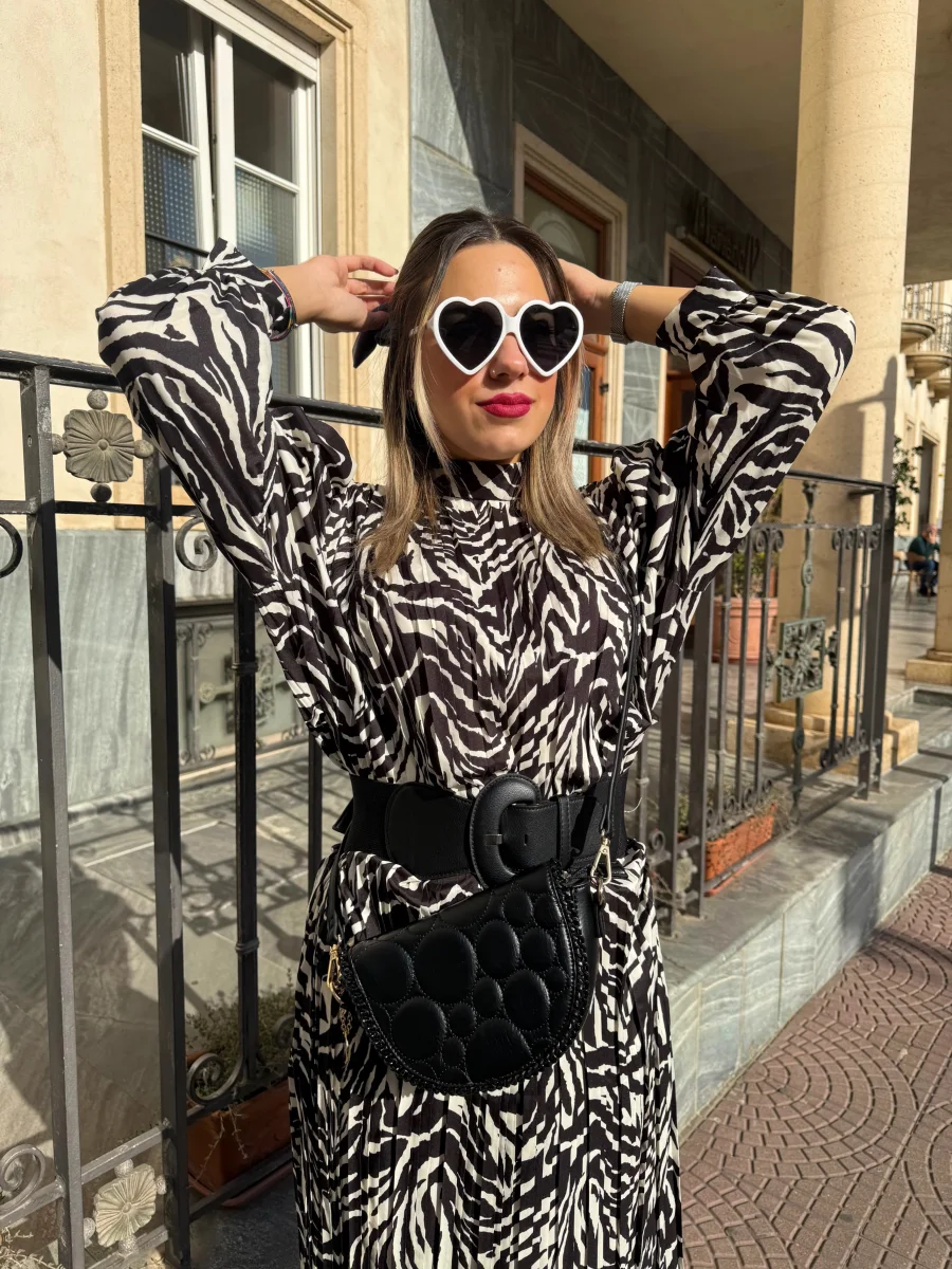 L’abito è lungo e caratterizzato da una stampa zebrata in bianco e nero. Ha una vestibilità fluida, con maniche lunghe e un taglio leggermente ampio. L’outfit è abbinato a una cintura nera indossata in vita per accentuare la silhouette. Il look che avrai sarà elegante e moderno, perfetto per una giornata di sole.
