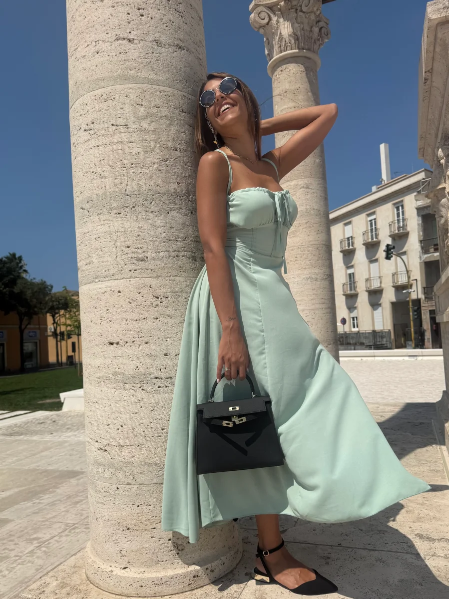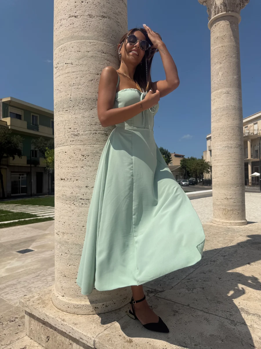 Abito in viscosa lungo dallo stile fresco e sensuale, perfetto per l’estate. Il corpetto presenta una struttura a bustier con cuciture evidenziate e coppe arricciate che valorizzano il décolleté. Le spalline sottili si incrociano sul davanti e proseguono sulla schiena con una chiusura intrecciata regolabile, creando un affascinante effetto “lace-up” sulla schiena scoperta. La gonna ampia e fluida cade morbida fino alle caviglie, arricchita da uno spacco frontale che aggiunge un tocco audace e femminile. Un modello ideale per chi cerca un look romantico ma deciso, adatto sia al giorno che alla sera.