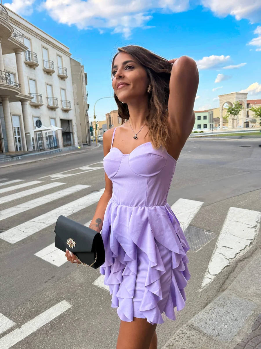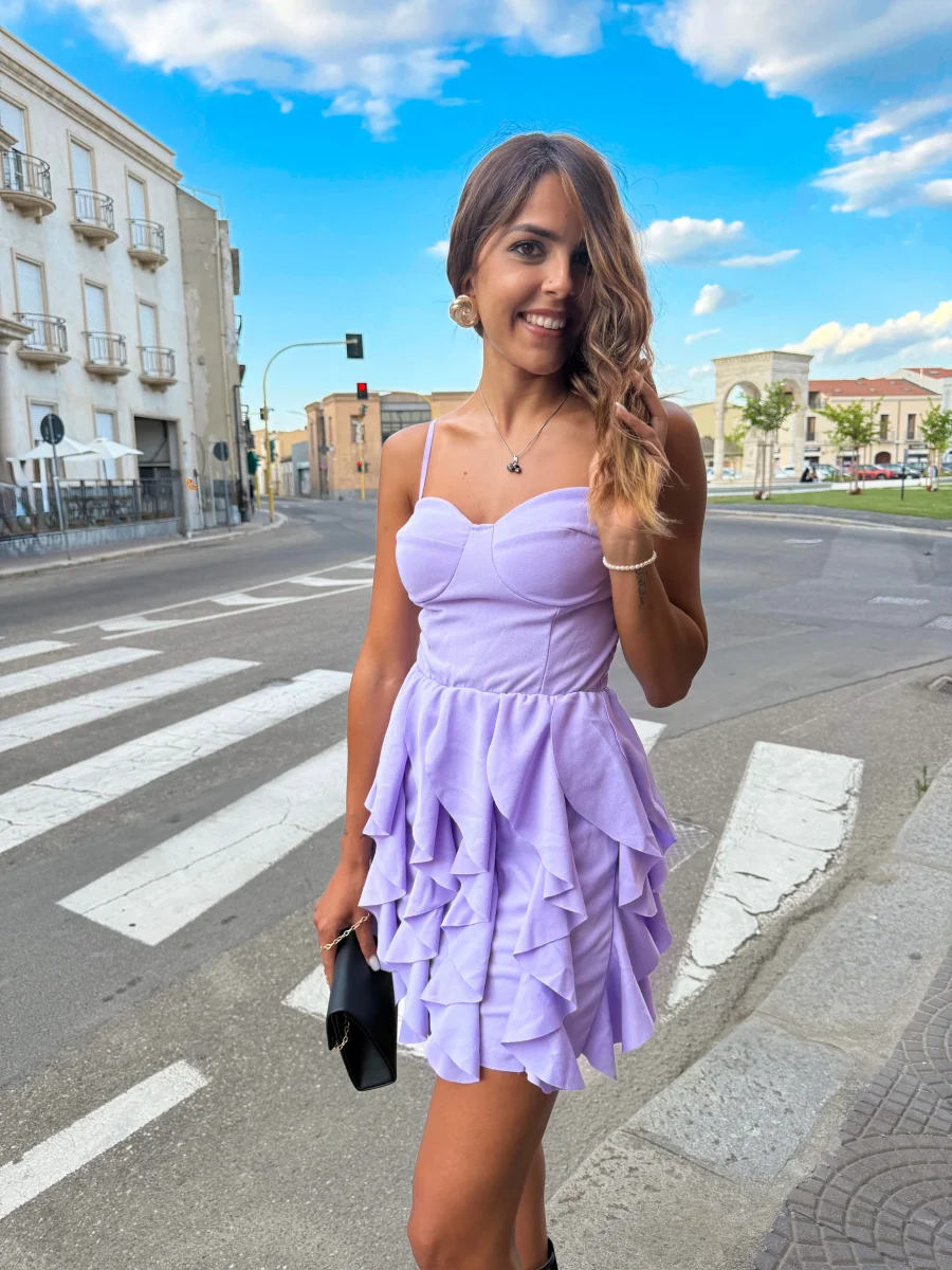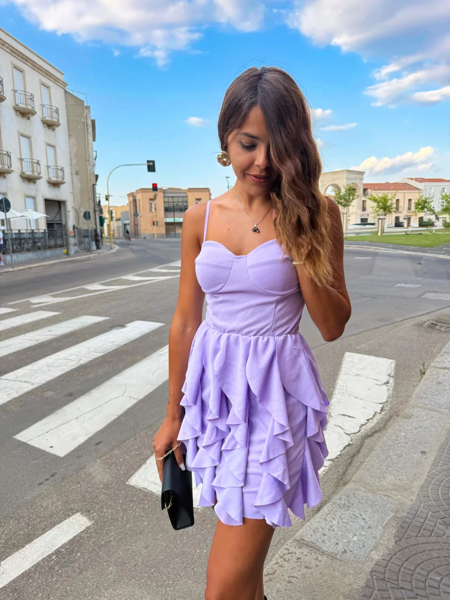 Abito corto lilla con balze – Stile romantico e trendy
