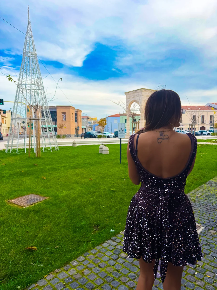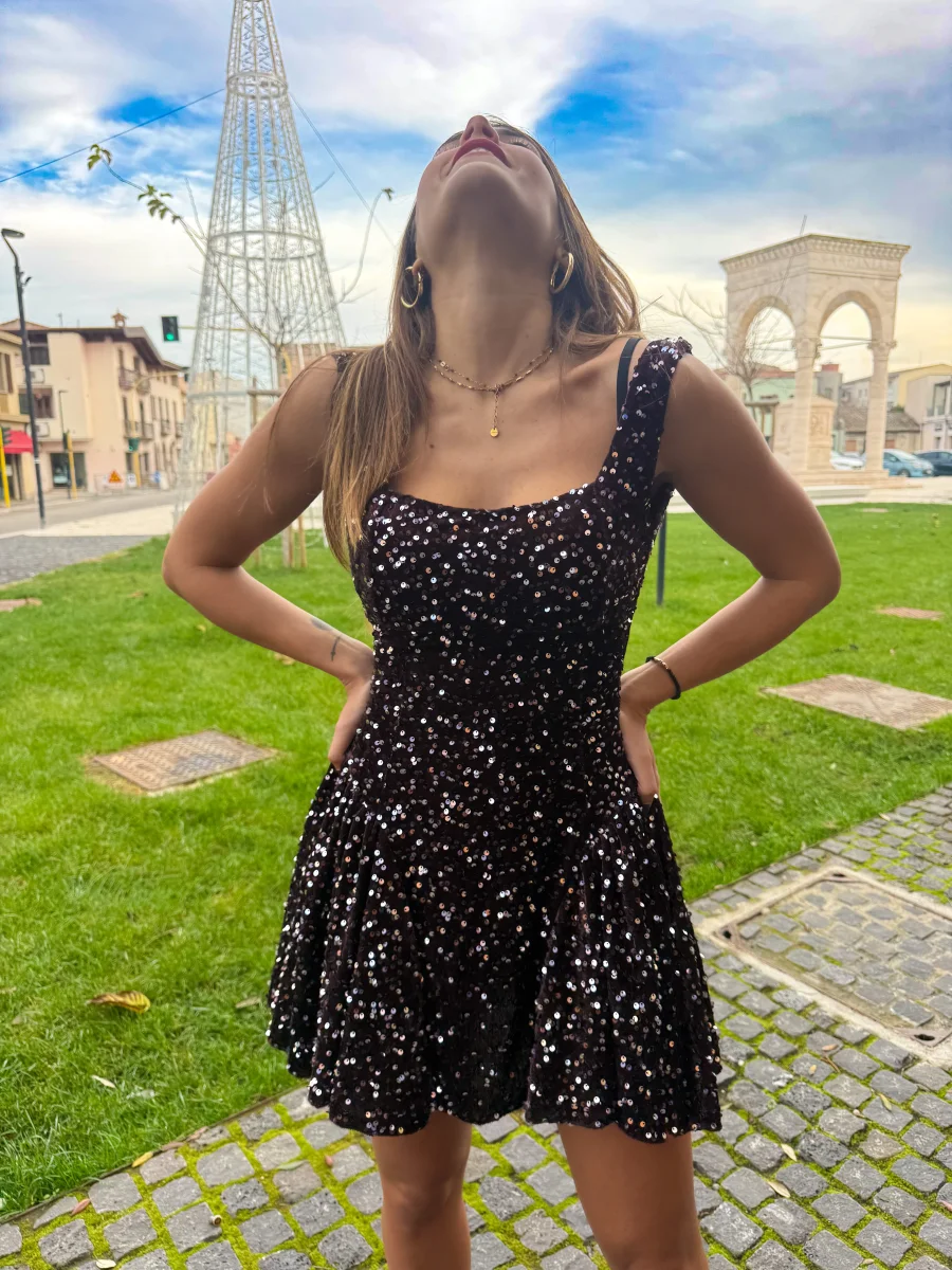 Abito mini dal mood elegante e super scintillante, con short integrato, ideale per feste e occasioni speciali. Interamente ricoperto di paillettes luminose, esalta la silhouette grazie alla linea svasata che dona movimento e leggerezza. Il design è impreziosito da uno scollo morbido sul davanti e da una profonda scollatura sulla schiena, con un delicato fiocco regolabile che aggiunge un tocco femminile e raffinato.