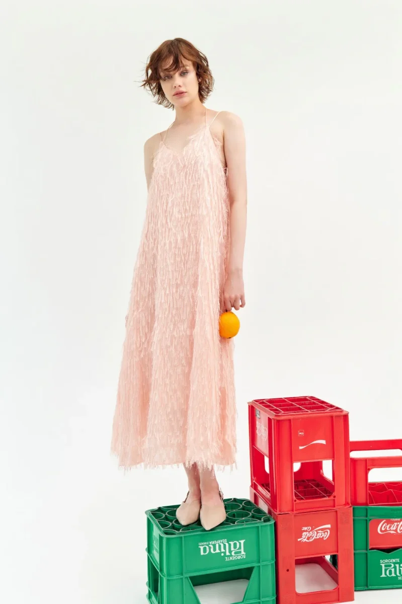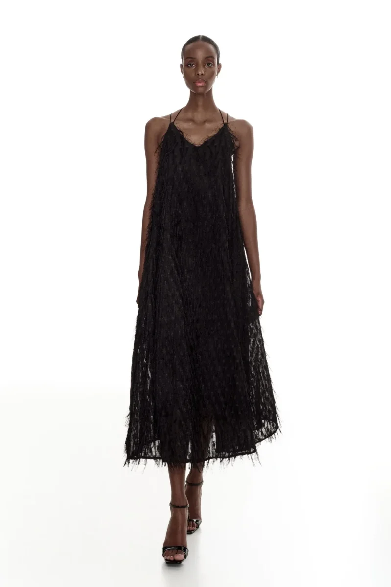 Abito Lumina 7/8, con spalline sottili e mini frange all over.