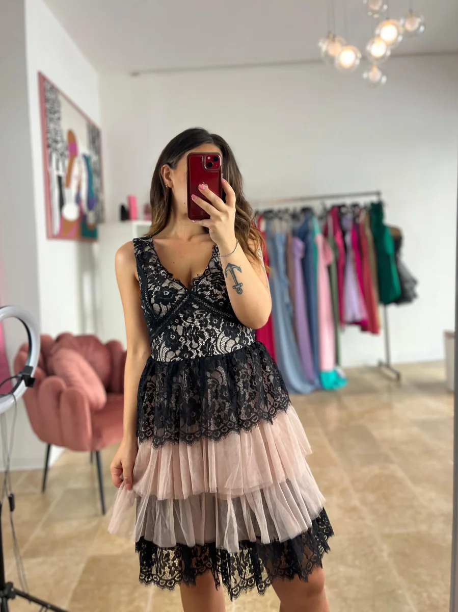 Abito midi dal design elegante e romantico, caratterizzato da una combinazione di pizzo nero e tulle nude. La parte superiore è realizzata in raffinato pizzo nero con scollatura a V, che conferisce un tocco femminile e sensuale. La vita è ben definita, creando una silhouette armoniosa.