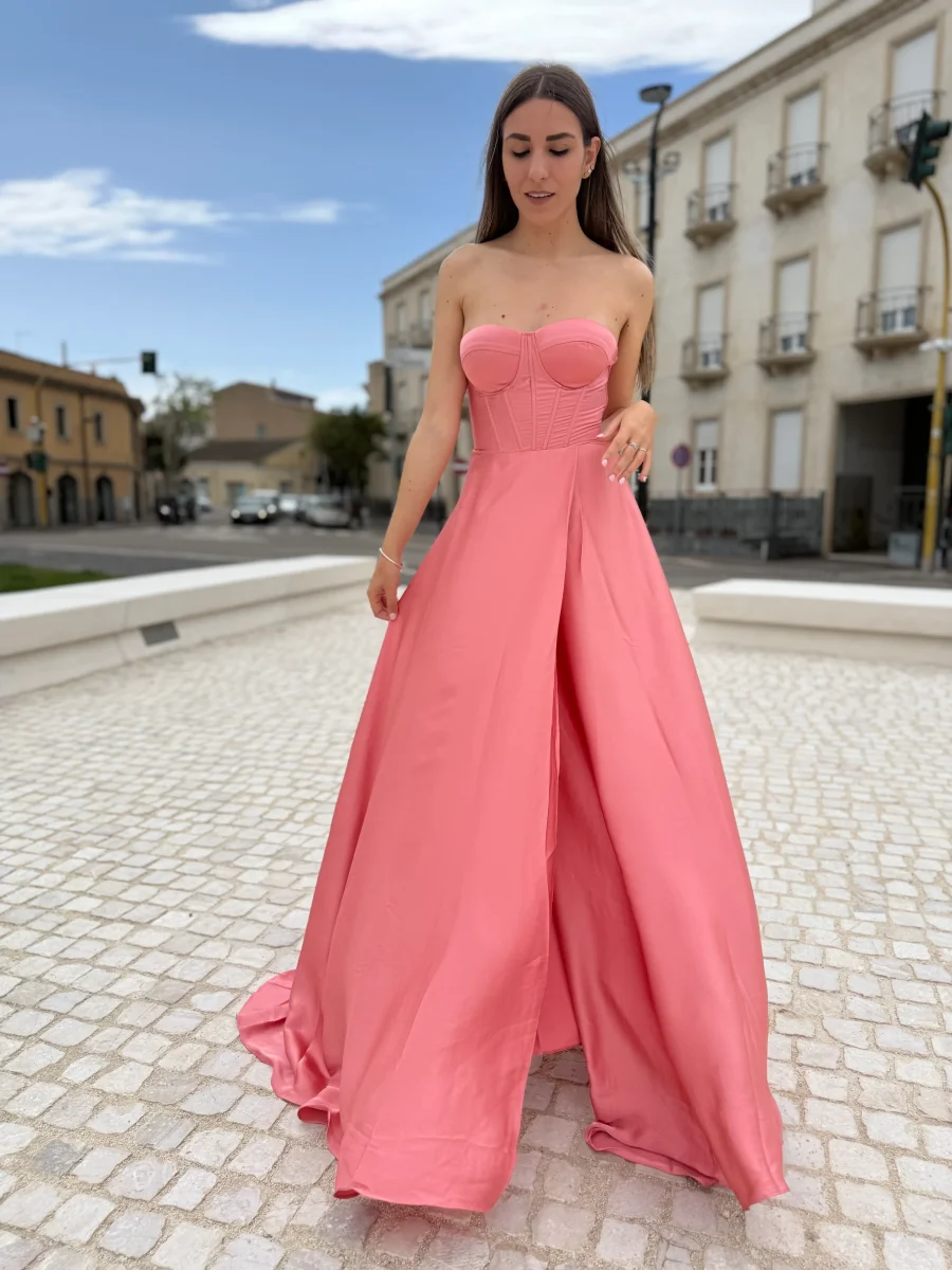 Abito lungo bustier in satin Scopri l’eleganza moderna con questo abito lungo in satin, perfetto per cerimonie, eventi speciali o serate da sogno. Il corpetto stile bustier con coppe strutturate e stecche verticali valorizza la silhouette e dona un tocco sensuale ma raffinato. La chiusura a corsetto sul retro, regolabile con lacci incrociati, assicura una […]