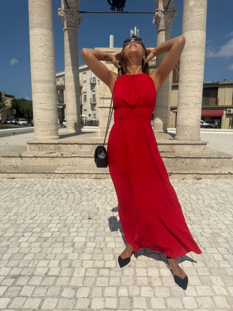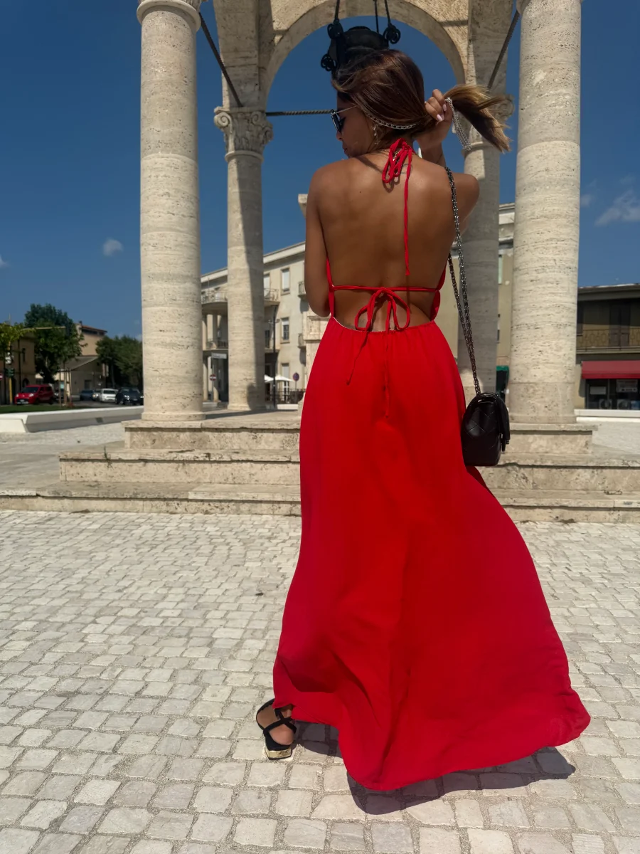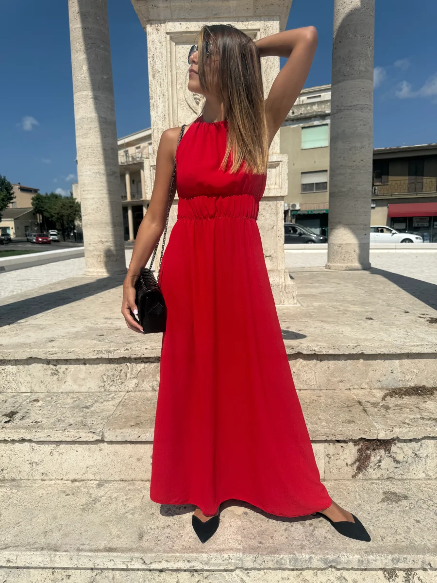 Abito lungo in viscosa in stile halter con scollo arricciato e chiusura con laccetti sul collo. Il design presenta una fascia elastica in vita che valorizza la silhouette e dona una vestibilità comoda. La particolarità del modello è il retro completamente scoperto, con doppia chiusura a fiocco che aggiunge un tocco sensuale e leggero, perfetto per la stagione estiva. Il taglio ampio e fluido lo rende ideale per look casual o da vacanza.
