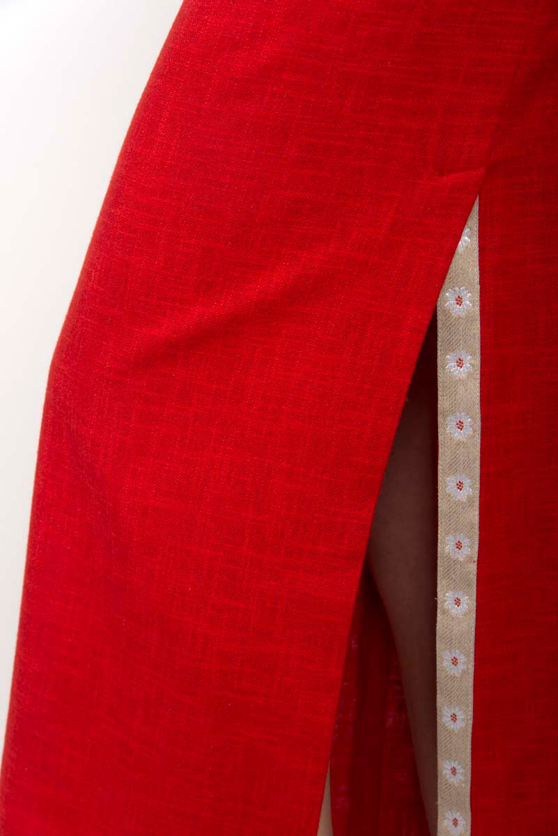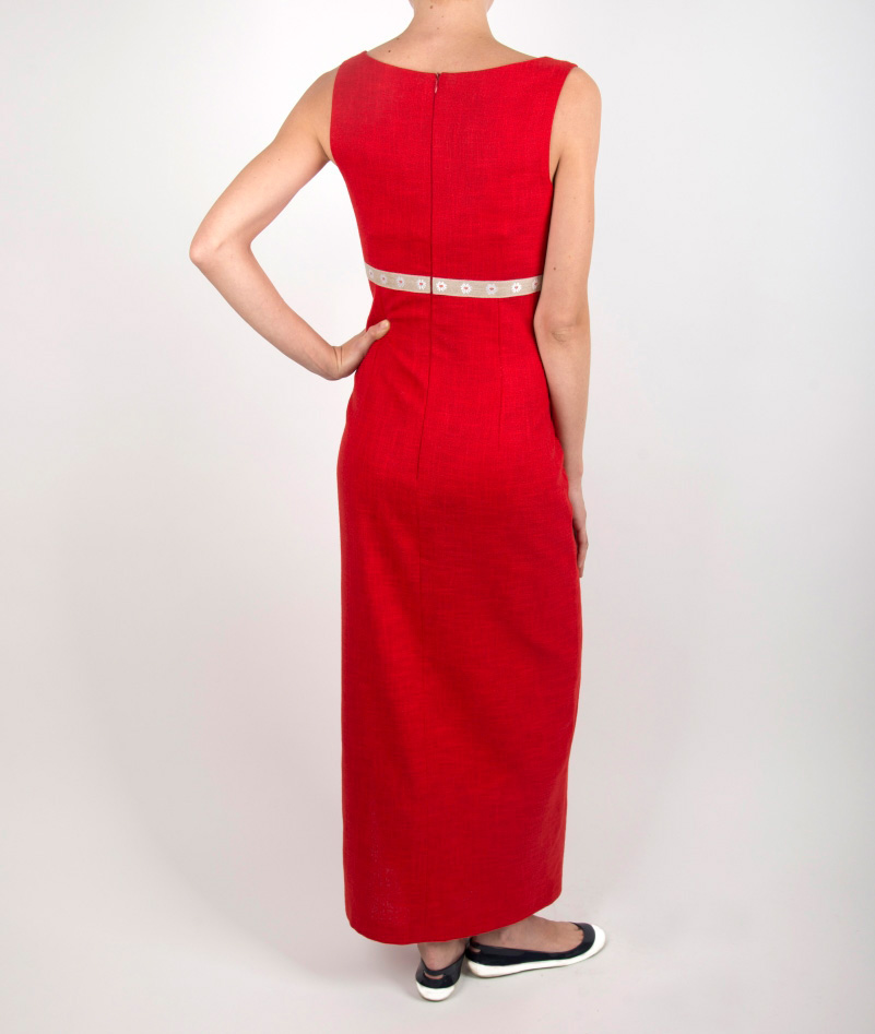 Abito rosso lungo da donna, sfoderato, senza maniche caratterizzato da un taglio stile impero e uno spacco lungo laterale. Questo abito da donna è realizzato in un tessuto molto fresco misto lino e viscosa. L’abito è rifinito con un bordino a fiori lungo lo spacco e intorno al taglio sotto il seno.