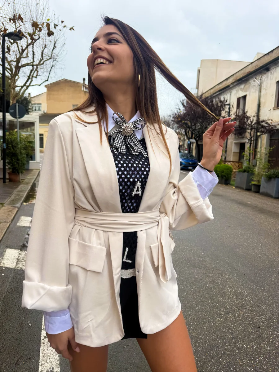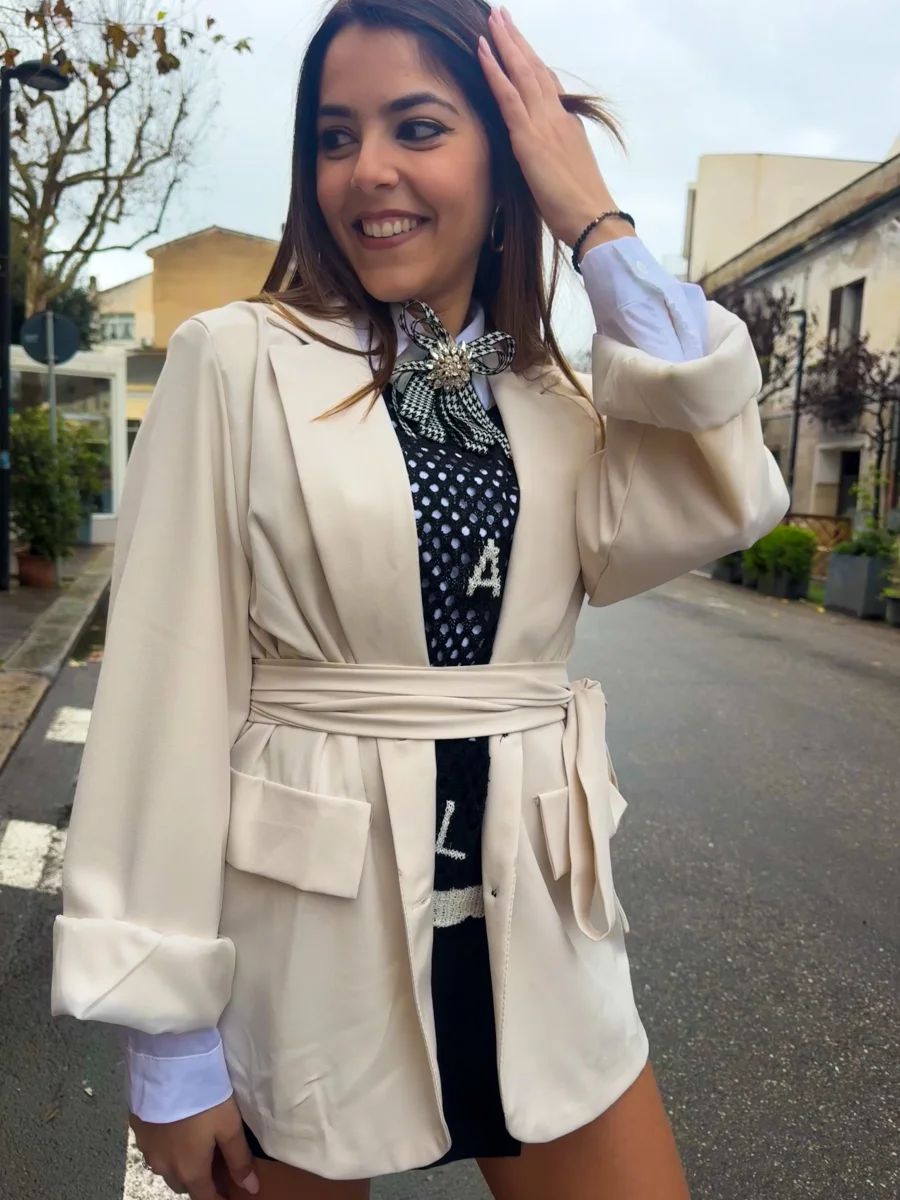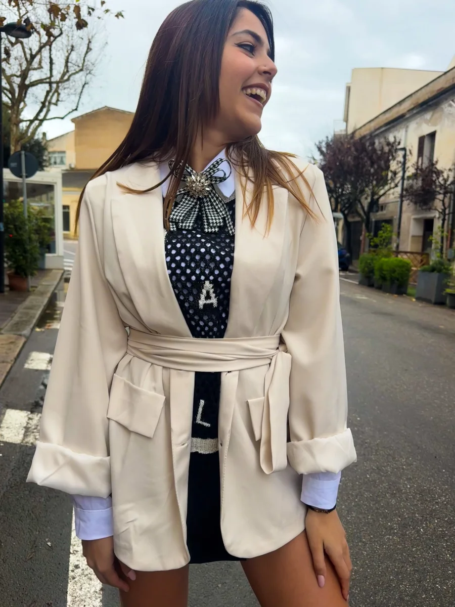 Blazer con bottoni, dal taglio elegante e femminile, pensato per valorizzare la silhouette grazie alla cintura coordinata in vita. Il design con rever classico richiama lo stile sartoriale, mentre la linea fluida lo rende versatile e adatto a diverse occasioni, dal quotidiano agli outfit più curati.