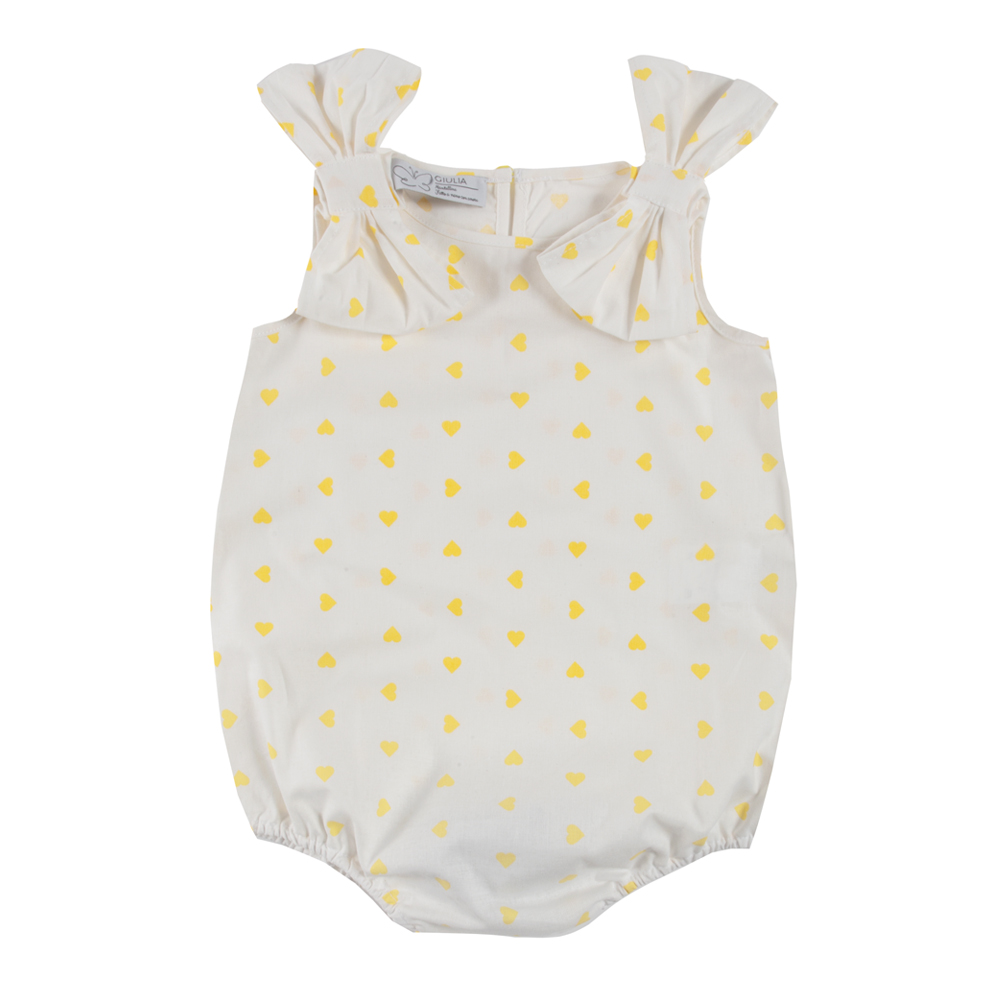 Body a cuoricini gialli Ioris in cotone allegro Il Body a cuoricini gialli Ioris in cotone 100% estivo è una briosa camicetta a body con fiocchi enormi sulle spalle, è un capo di abbigliamento neonata realizzato dalle nostre sarte, tutto Made in Italy. La camicetta-body si allaccia sotto con automatici a pressione e dietro alla schiena con bottone. Il pagliaccetto Ioris puoi abbinalo con la Gonna Amelia color giallo o jeans creando un completo moda neonata frizzante e ideale per ogni occasione. Completa l’outfit della tua bambina con la Mantellina Margherita in jeans. Dettagli body bambina tessuto cotone a cuoricini…