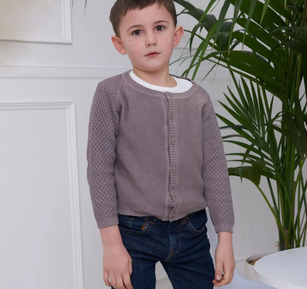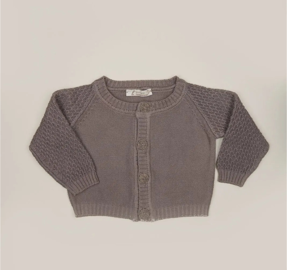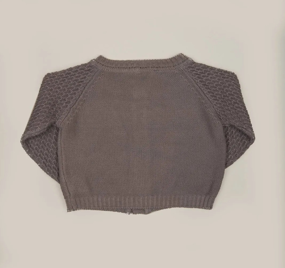 Cardigan per neonati e bambini aperto sul davanti con manica a taglio raglan e lavorazione sulle maniche, grigio talpa, in cotone organico con lavorazione a contrasto sul davanti; 100% made in Italy, realizzato con tintura naturale di mallo di noce.