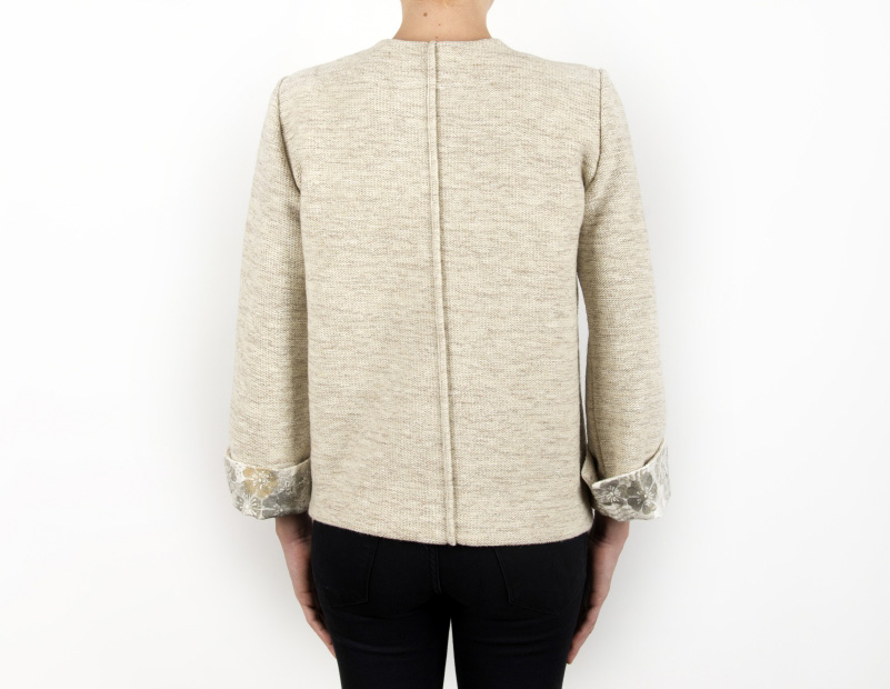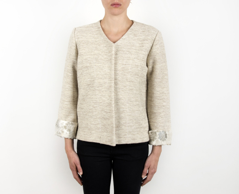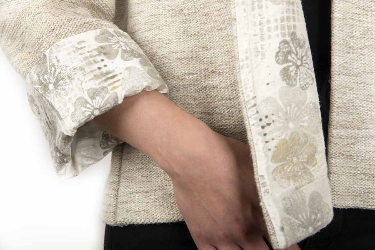Ideale per le mezze stagioni è questo cardigan corto in maglia la cui realizzazione è frutto di uno studio sulla confezionabilità delle lane delle pecore sarde allevate in Toscana. Il filato è in 60% lana, 30% viscosa e 10% nylon. Il colore beige melangiato del cardigan è dato da quello naturale della lana misto alla viscosa colorata. Le rifiniture interne e quelle ai polsi sono in 100% seta, tinta e stampata a mano con dei decori floreali. Con la stampa a mano questo cardigan diventa un pezzo unico. Il cardigan è lavabile a mano con acqua fredda.