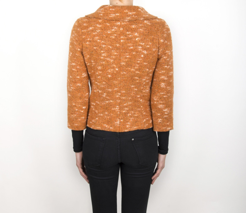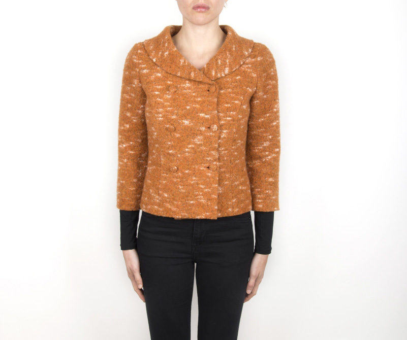Giubbino donna in lana cotta a doppio petto, colore arancione maculato bianco. La giacchina è sfoderata e ha le maniche a 3/4. Molto fashion e sportivo è la lavorazione a taglio vivo. I bottoni del giubbino sono foderati nel tessuto della giacchina e gli occhielli sono ricamati a mano.