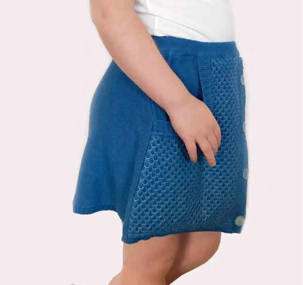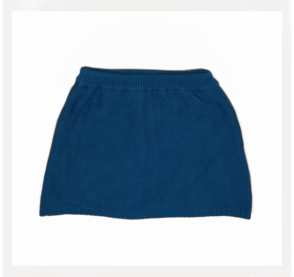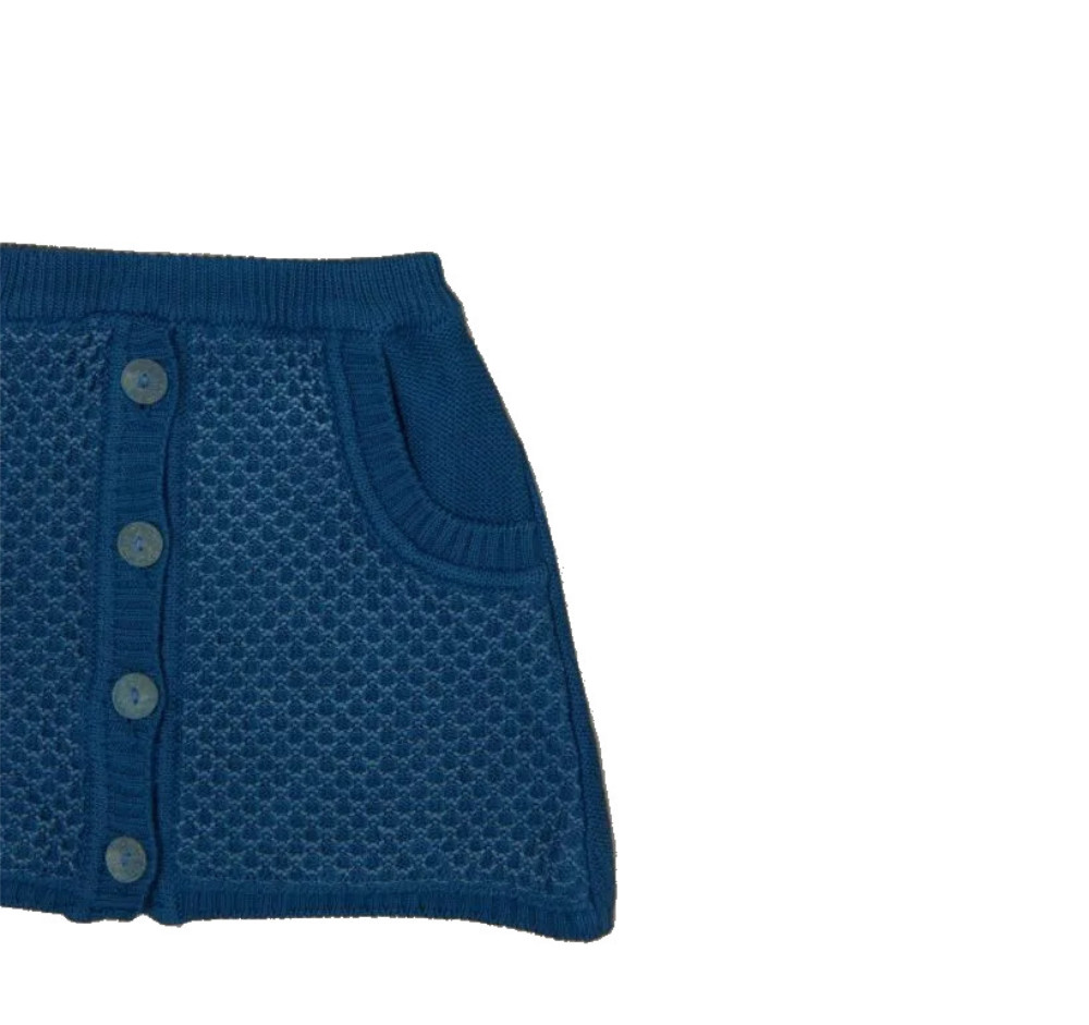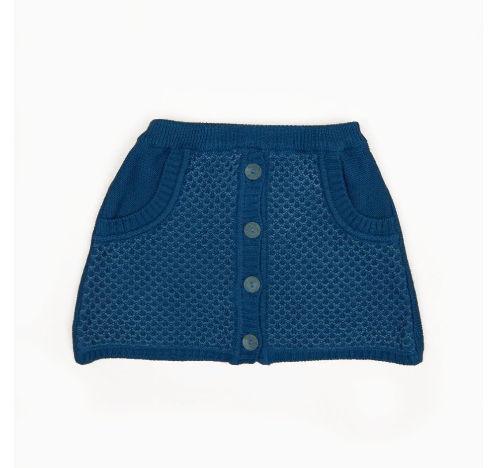 Gonna con elastico in vita e bottoncini sul davanti in cotone organico con lavorazione a contrasto e due taschine laterali; 100% made in Italy, realizzato con tintura naturale. Composizione: 80% cotone biologico, 20% seta, bottoni in carta riciclata, etichetta in fibra di latte