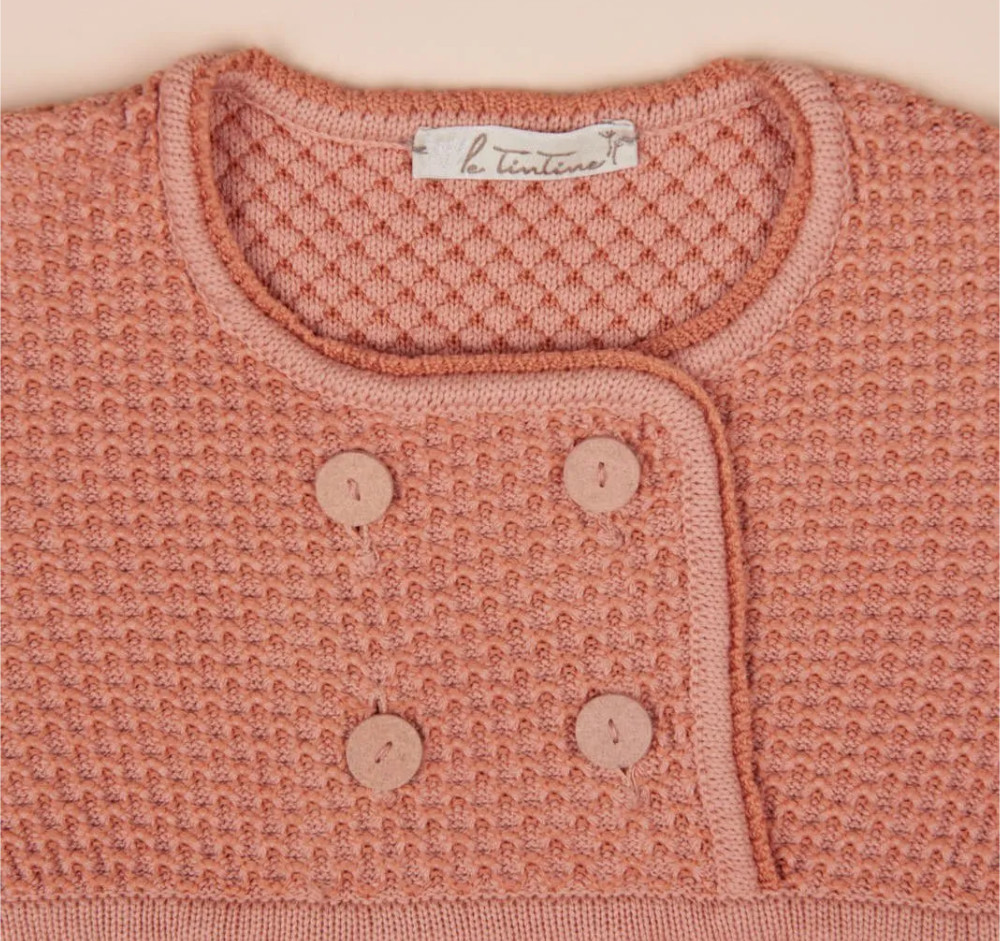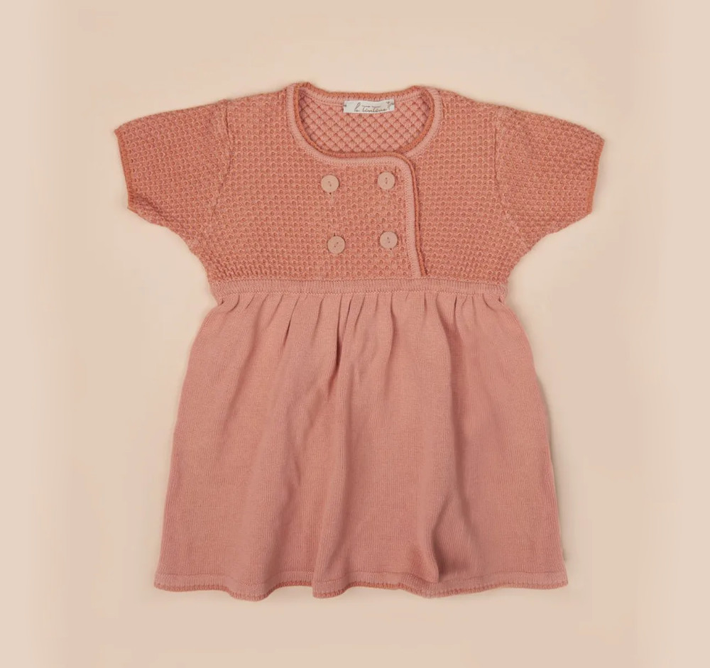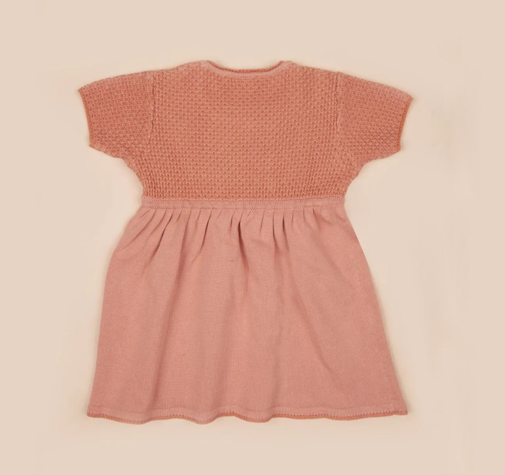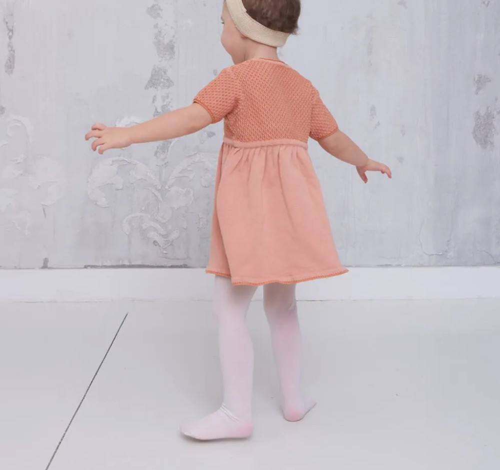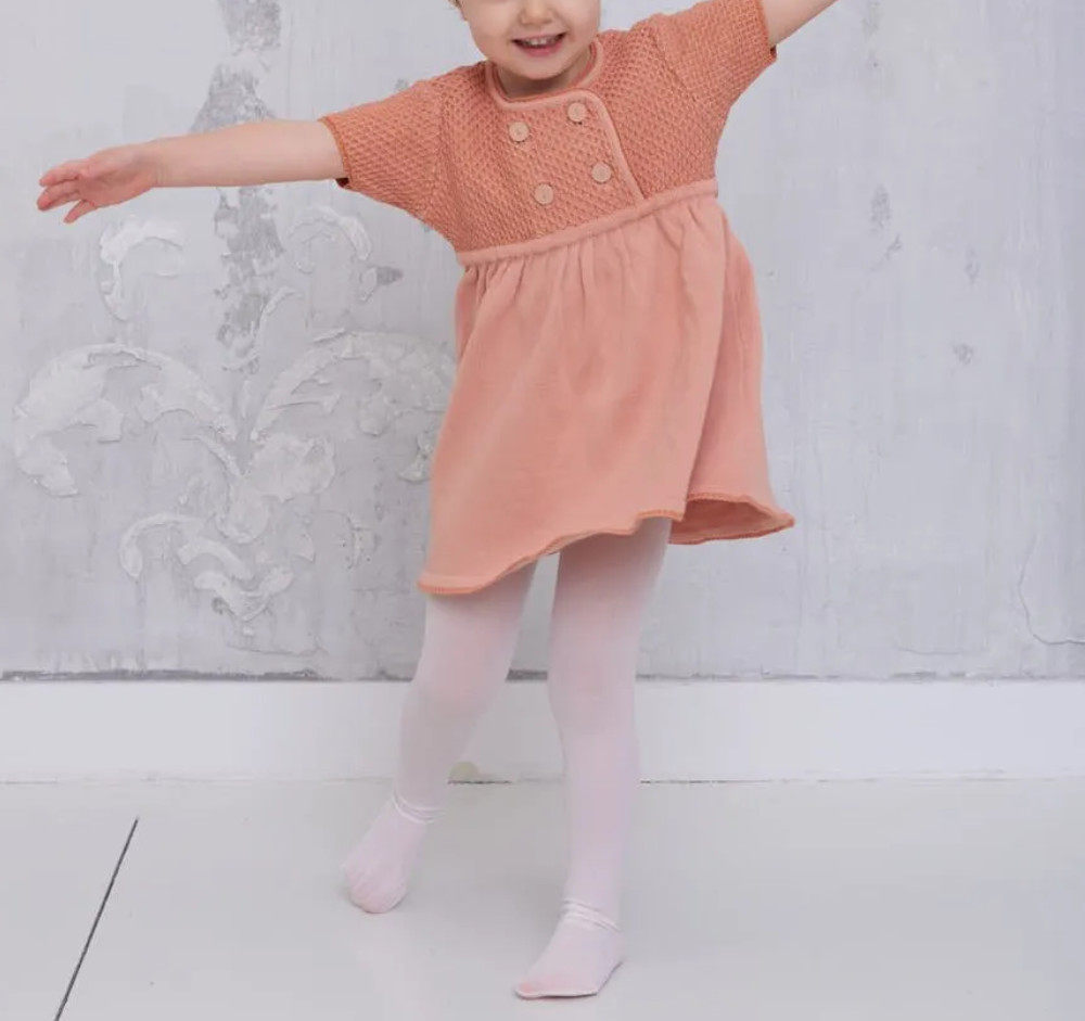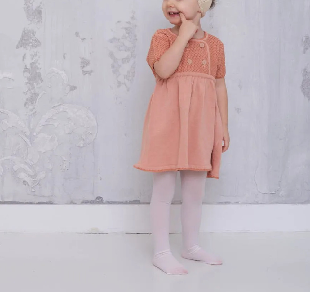 Abitino color salmone per bambina con corpino lavorato in cotone biologico e seta, prodotto da artigiani italiani e tinto con robbia.