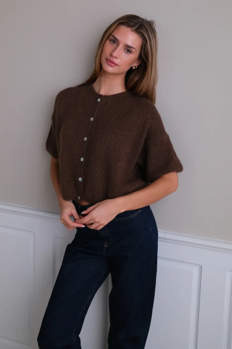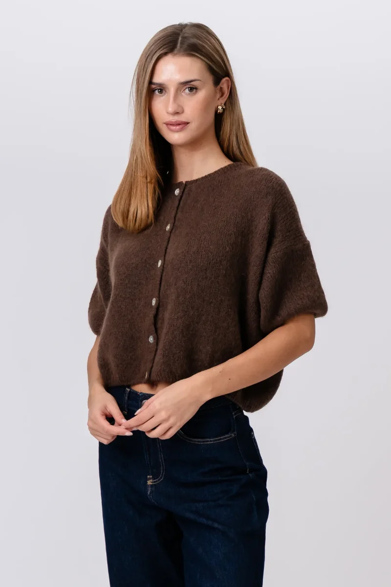 Ti presentiamo il maglione lavorato a maglia a maniche corte Mary: il capo che il tuo guardaroba stava aspettando. Progettato per la donna moderna che apprezza sia lo stile che la sostanza, questo maglione รจ la risposta perfetta all’abbigliamento di transizione e alla raffinatezza per tutto l’anno. In un ricco marrone terroso, offre una versatilitร infinita, portandoti senza sforzo da un’intensa giornata lavorativa a un fine settimana rilassato. ร piรน di un semplice capo di abbigliamento; รจ la base per innumerevoli outfit chic, promettendo di essere un punto fermo che raggiungerai ancora e ancora.