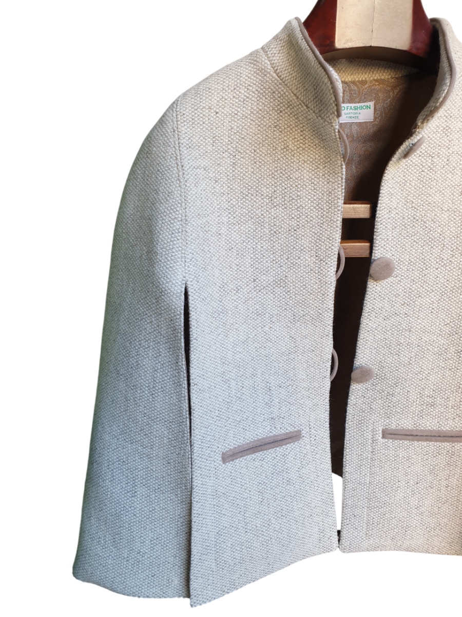 Avvolgiti nel calore della Toscana. Questa mantella è un pezzo unico, realizzato a mano con lane locali e tessute con antichi telai. Il colore naturale della lana, delicatamente abbracciato da rifiniture in pregiata alcantara beige scuro, evoca l’autentica bellezza della campagna toscana. La fodera a contrasto aggiunge un tocco di vivacità, rendendo ogni capo un vero e proprio oggetto del desiderio. Un capospalla esclusivo, perfetto per chi cerca un’eleganza senza tempo e un tocco di artigianalità italiana.