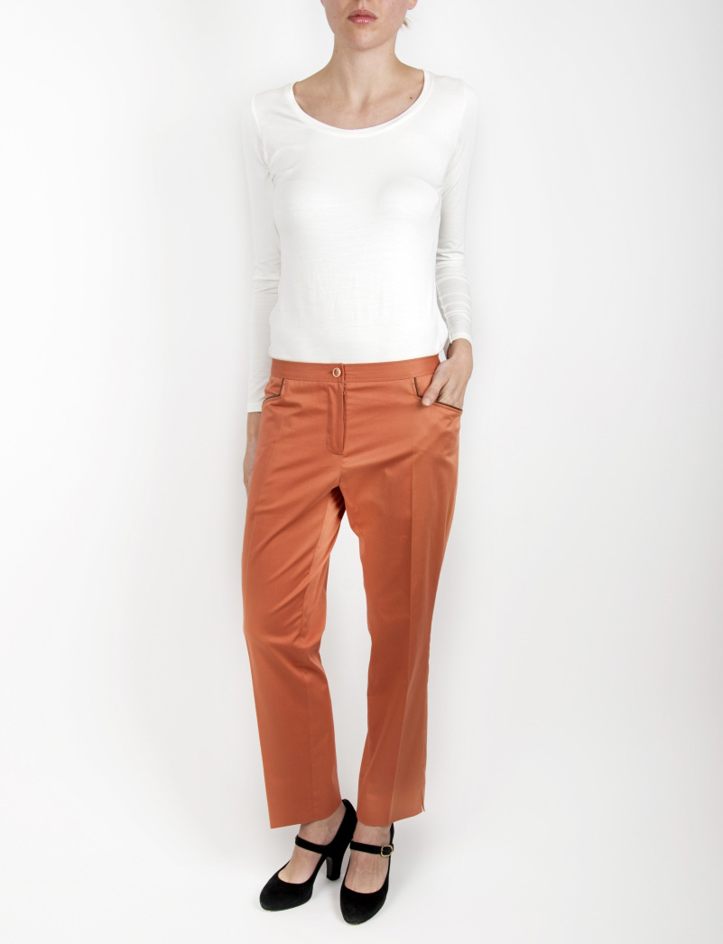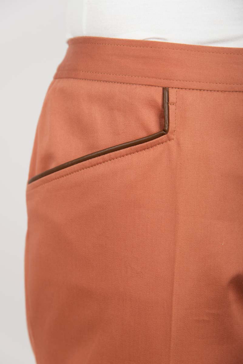 Pantalone donna a vita bassa, confezionato in gabardina (100% cotone) di colore arancio. Si chiude con una cerniera sul davanti. Le due tasche sono tagliate e profilate in pelle.