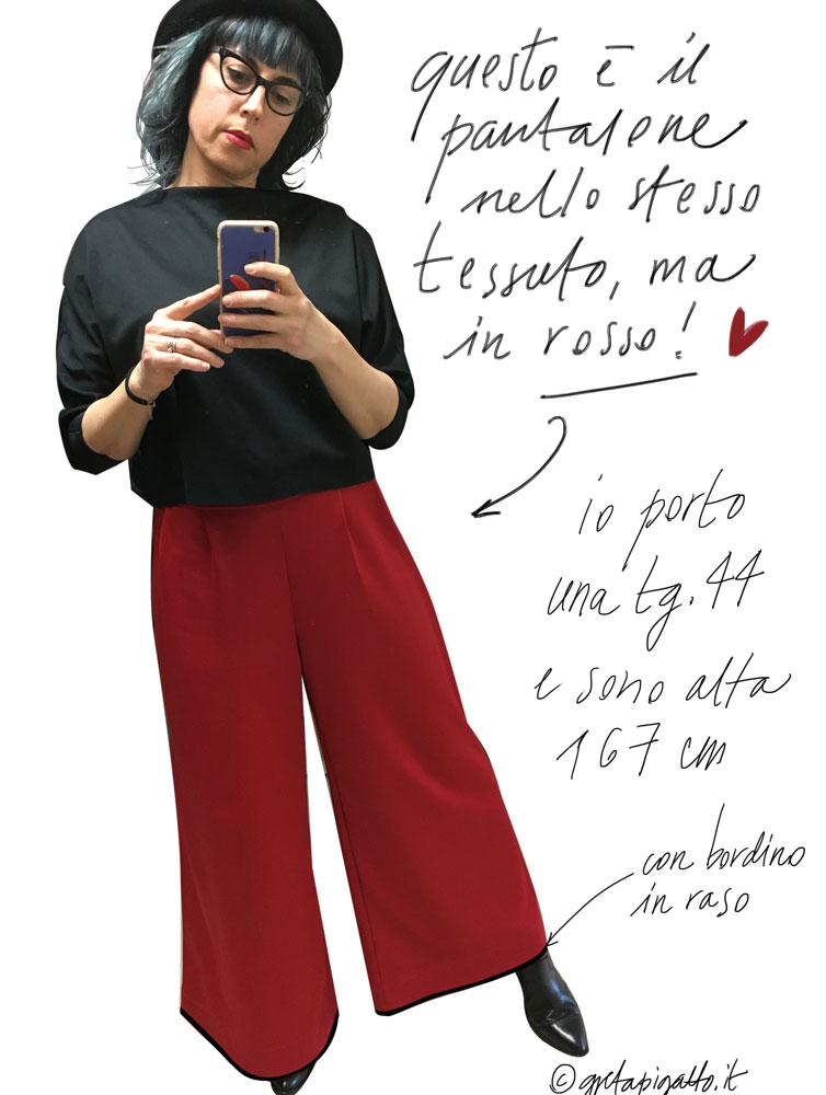 Confeziono con cura questo pantalone nel mio garage-lab a Breganze VI. Puoi sceglierlo in nero o rosso. Taglie disponibili dalla 40 alla 46. Elastico in vita. Spese di spedizione gratuite. Ho selezionato un tessuto nero in stock, dal mio fornitore di tessuti, che tratta tutto in Italia con certificazioni Oeko – tex, se vuoi saperne di più, puoi approfondire cosa significa questo tipo di certificazioni, leggendo questo articolo del mio diario: La certificazione oeko tex cos’è? Per avere tutte le informazioni necessarie al tuo acquisto consulta qui sotto la DESCRIZIONE del prodotto qui sotto.