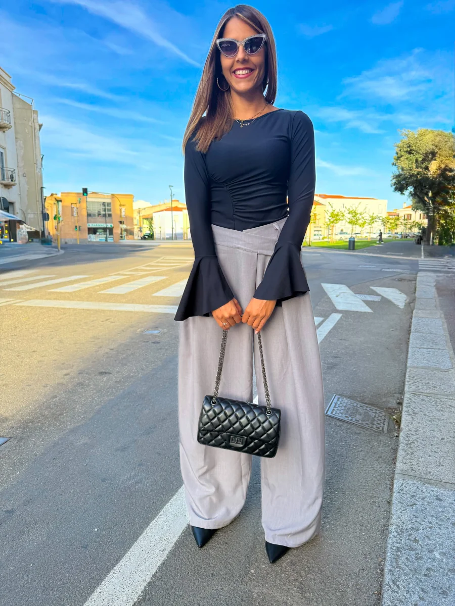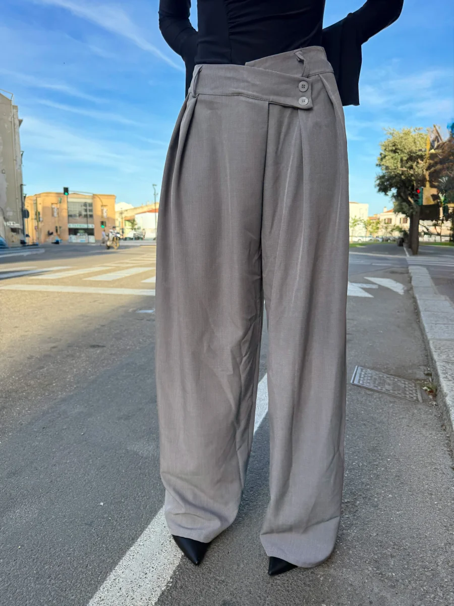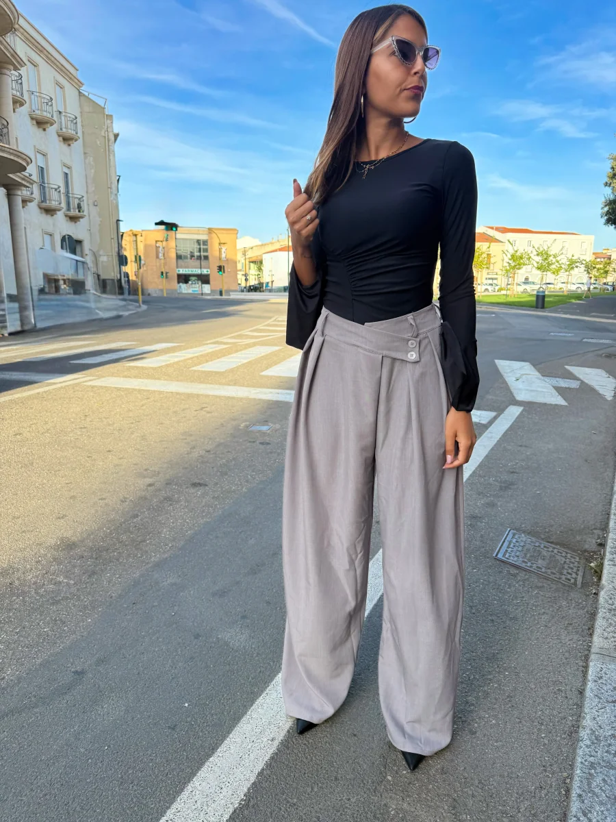 Questi pantaloni presentano un taglio a vita alta che slancia la silhouette e mette in risalto il punto vita. La gamba è morbida con linea dritta leggermente ampia, pensata per garantire comfort e movimento senza rinunciare allo stile. Le tasche laterali aggiungono praticità, mentre la chiusura frontale con zip e bottone completa il design essenziale e versatile.