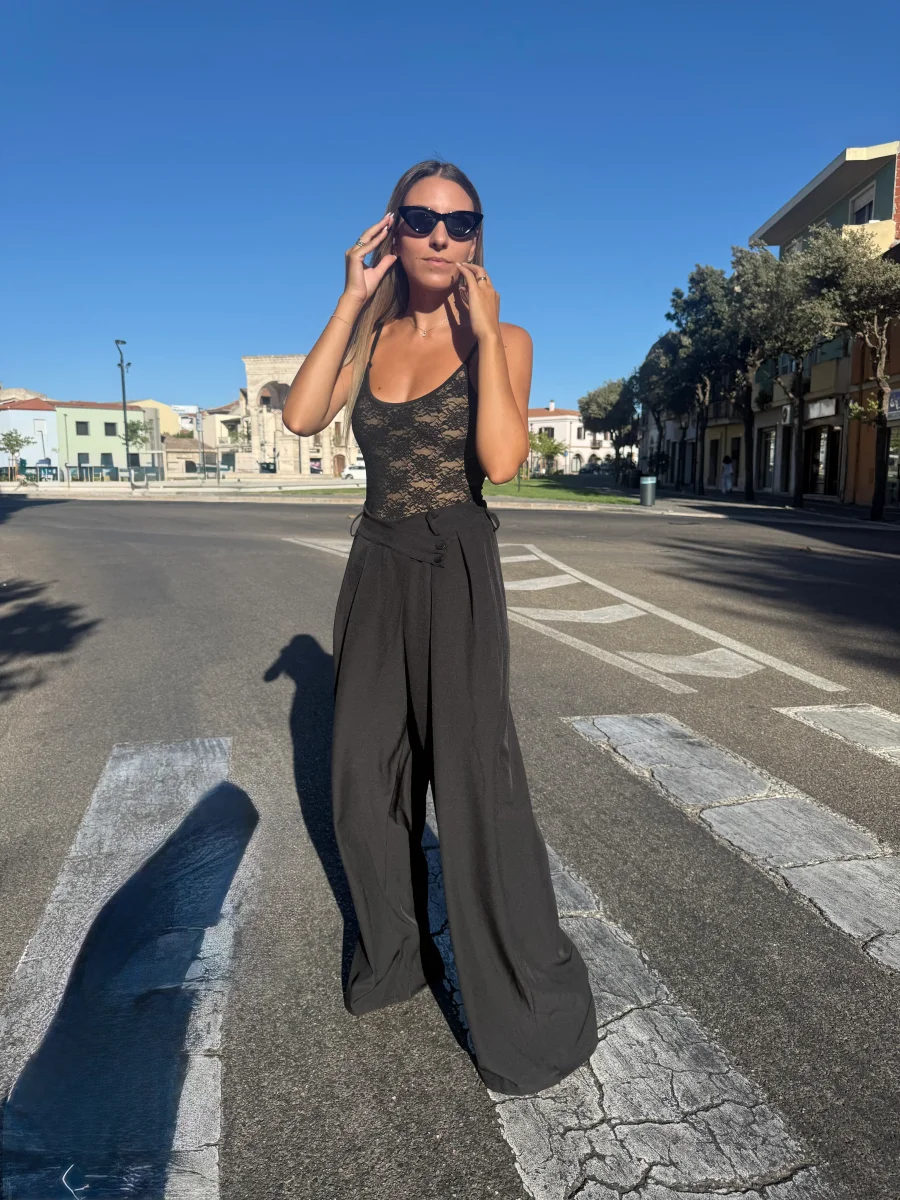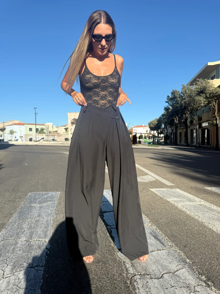 Questi pantaloni presentano un taglio a vita alta che slancia la silhouette e mette in risalto il punto vita. La gamba è morbida con linea dritta leggermente ampia, pensata per garantire comfort e movimento senza rinunciare allo stile. Le tasche laterali aggiungono praticità, mentre la chiusura frontale con zip e bottone completa il design essenziale e versatile.