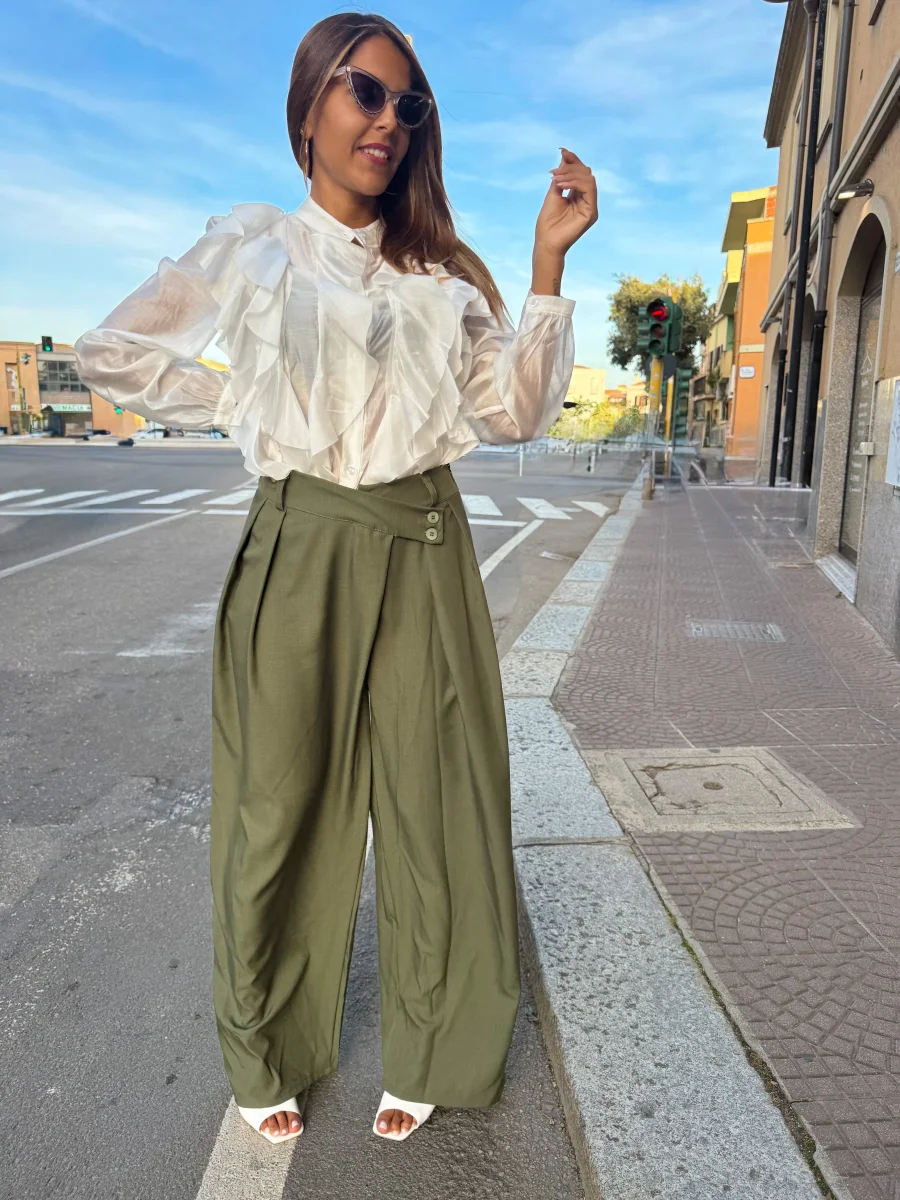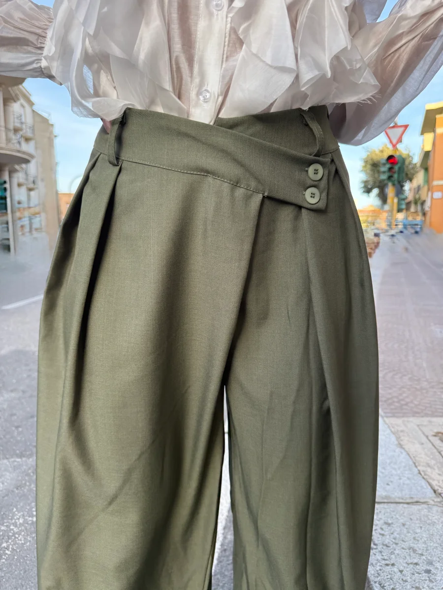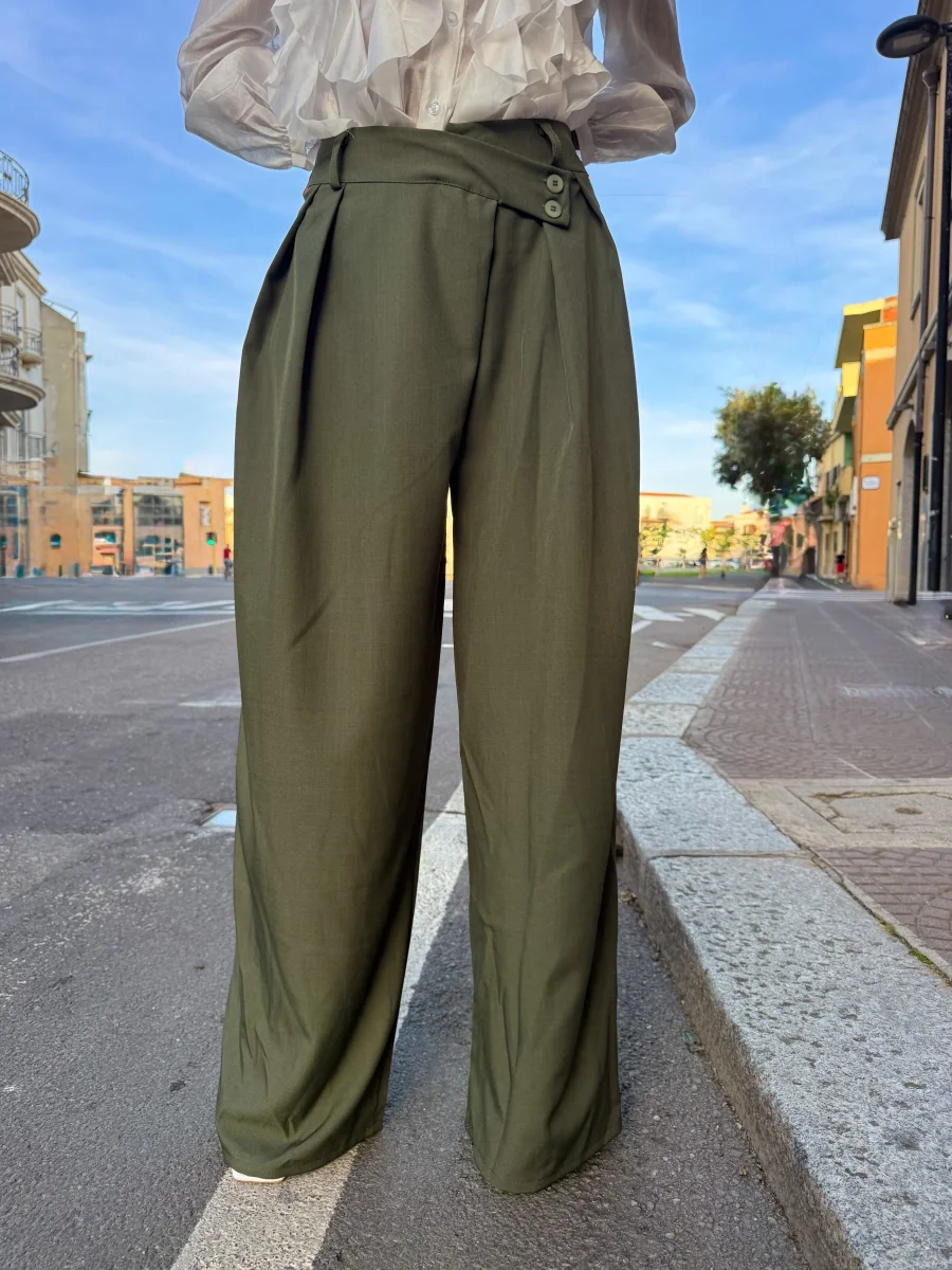 Questi pantaloni presentano un taglio a vita alta che slancia la silhouette e mette in risalto il punto vita. La gamba è morbida con linea dritta leggermente ampia, pensata per garantire comfort e movimento senza rinunciare allo stile. Le tasche laterali aggiungono praticità, mentre la chiusura frontale con zip e bottone completa il design essenziale e versatile.