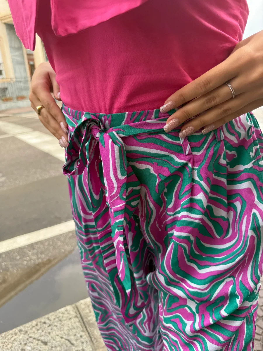 Pantaloni fantasia a gamba larga Pantaloni ampi in tessuto leggero con stampa psichedelica nei toni del fucsia, verde e bianco. Vita alta con cintura in coordinato e tasche laterali. Comodi e scenografici, sono perfetti per chi ama distinguersi.