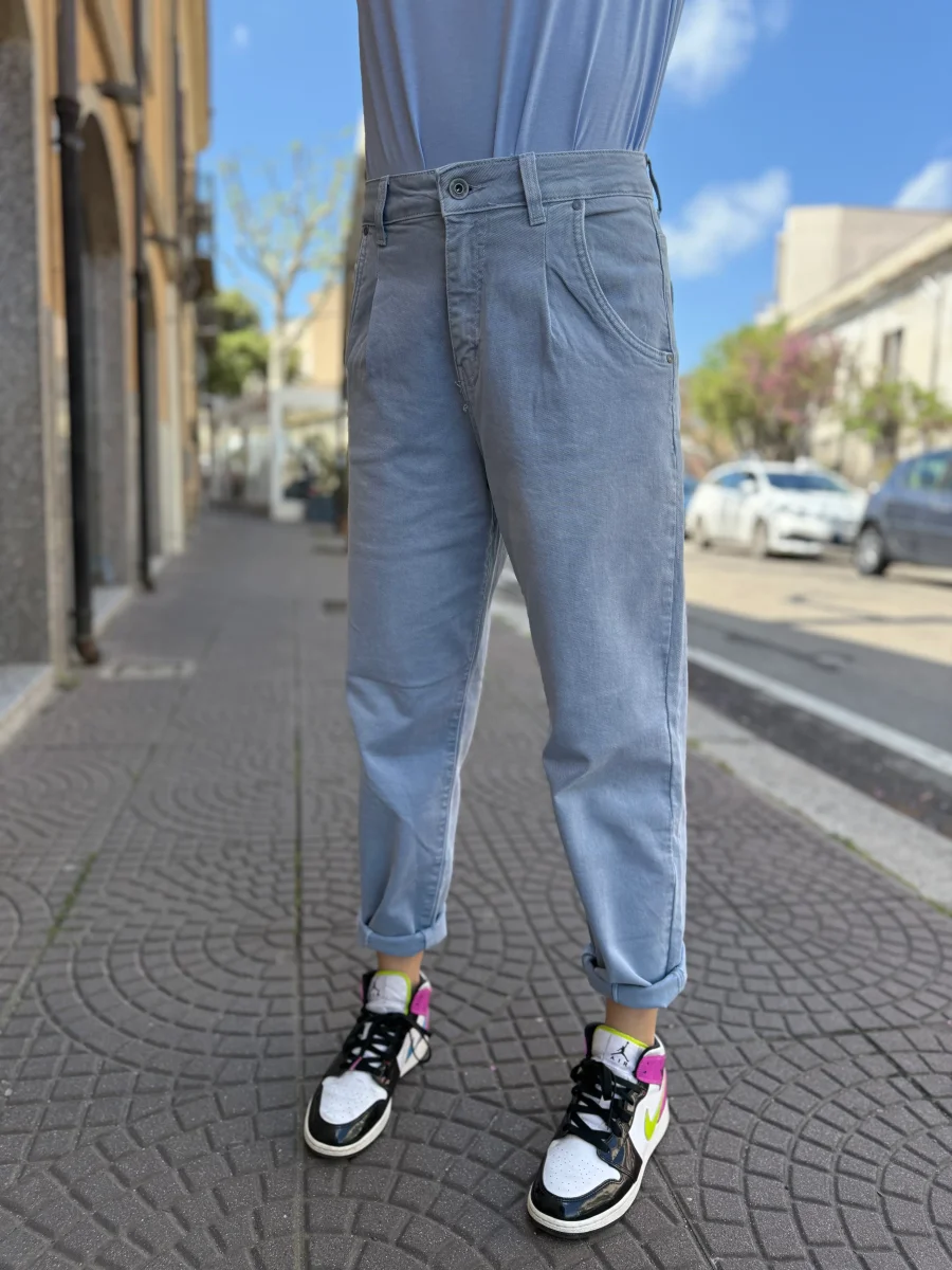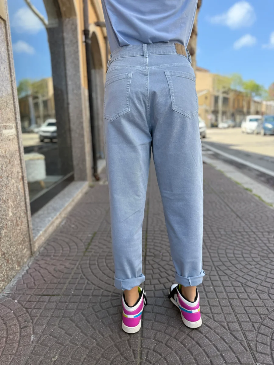 Scopri il comfort e lo stile dei nostri pantaloni Mom Fit in un delicato azzurro chiaro. Realizzati in un tessuto morbido e leggero, offrono una vestibilità comoda con vita alta e gamba leggermente affusolata, perfetta per un look rilassato ma sempre curato.