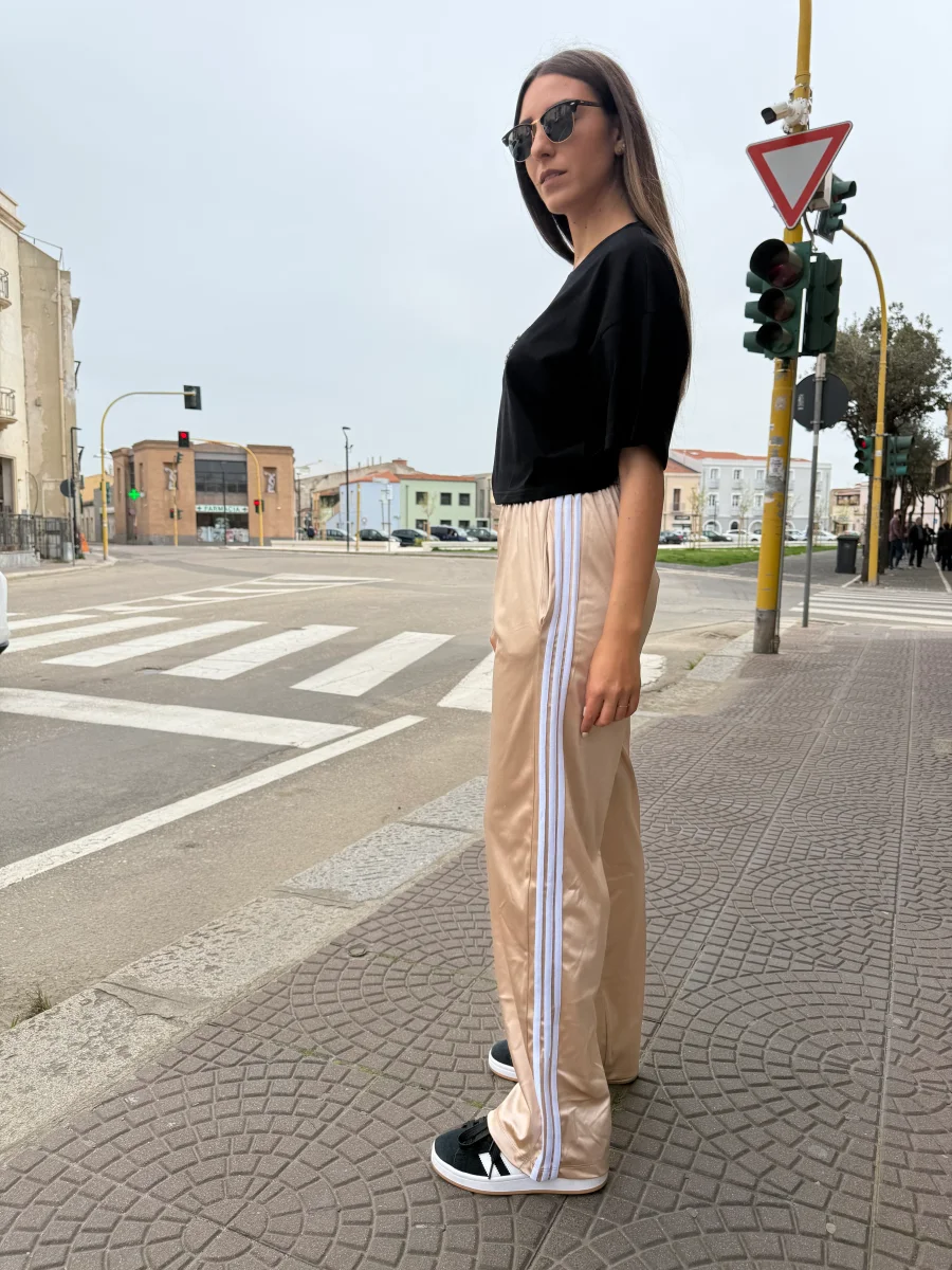 Brilla anche nei look casual con questi pantaloni sporty-chic in raso satinato color champagne. Il taglio ampio e rilassato, unito alla vita elasticizzata, garantisce massimo comfort senza rinunciare allo stile. Le bande laterali bianche aggiungono un tocco atletico ispirato allo streetwear, perfetto per uno stile urbano e moderno.