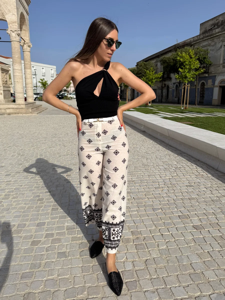 Pantaloni in cotone bianco con stampa geometrica nera in stile etnico. Vita alta, gamba dritta e lunghezza alla caviglia. Comodi e leggeri, aggiungono un tocco boho chic al tuo guardaroba estivo.