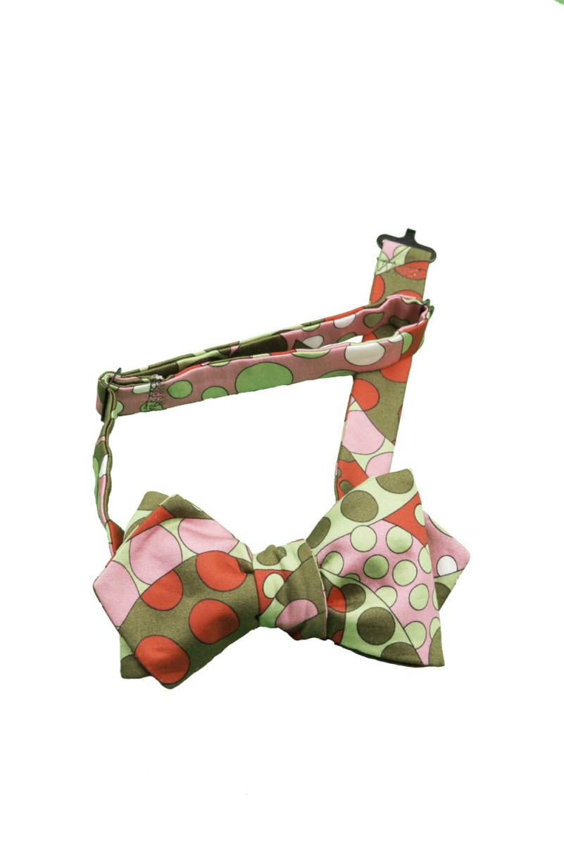Papillon da annodare; fantasia rosso, verde e rosa; 100% cotone; circonferenza del collo regolabile