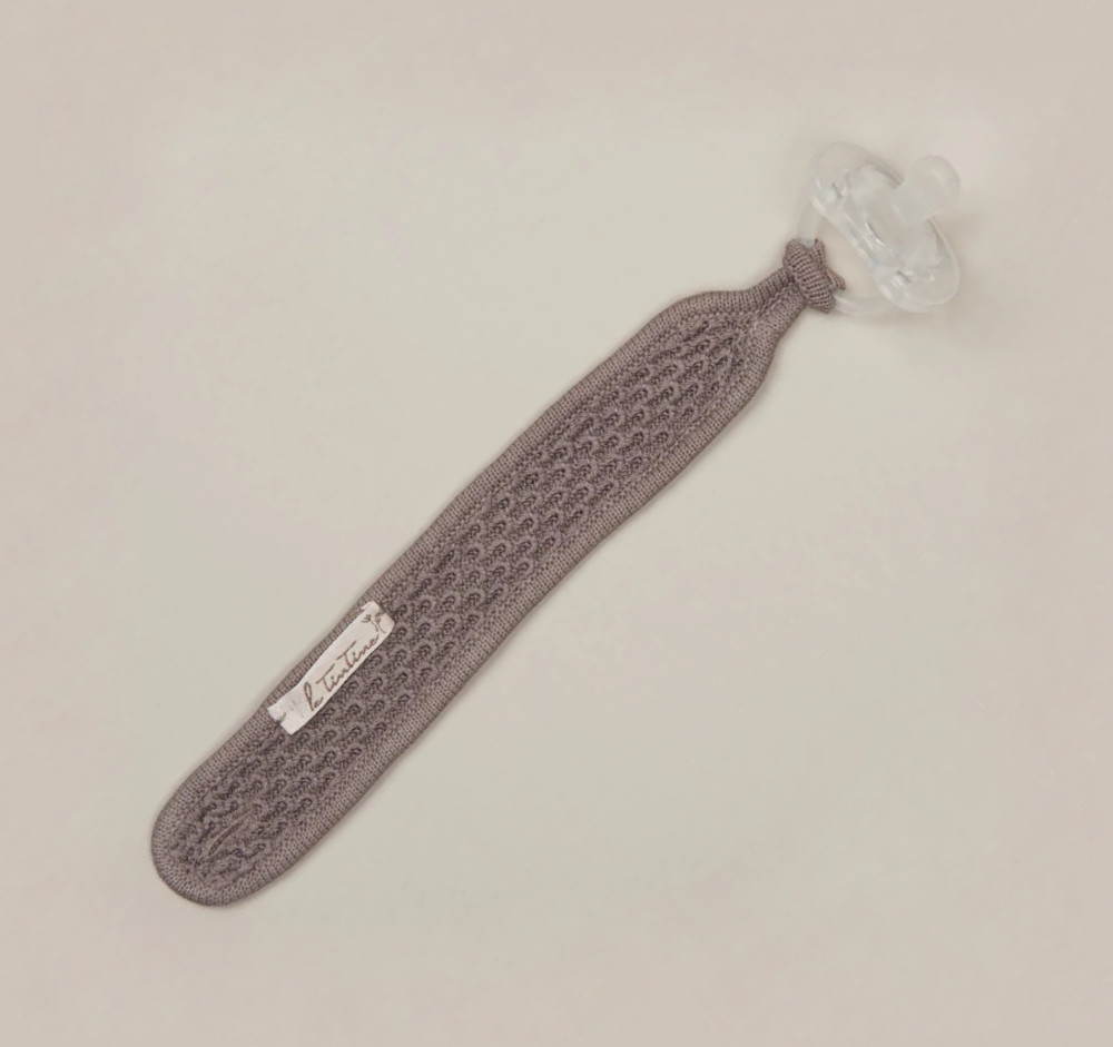 Portaciuccio coordinato ai capi, con laccetto per legare il ciuccio e asola per attaccarsi al bottone del body o del cardigan abbinato. Pratico e morbido, adatto fin dalla nascita.