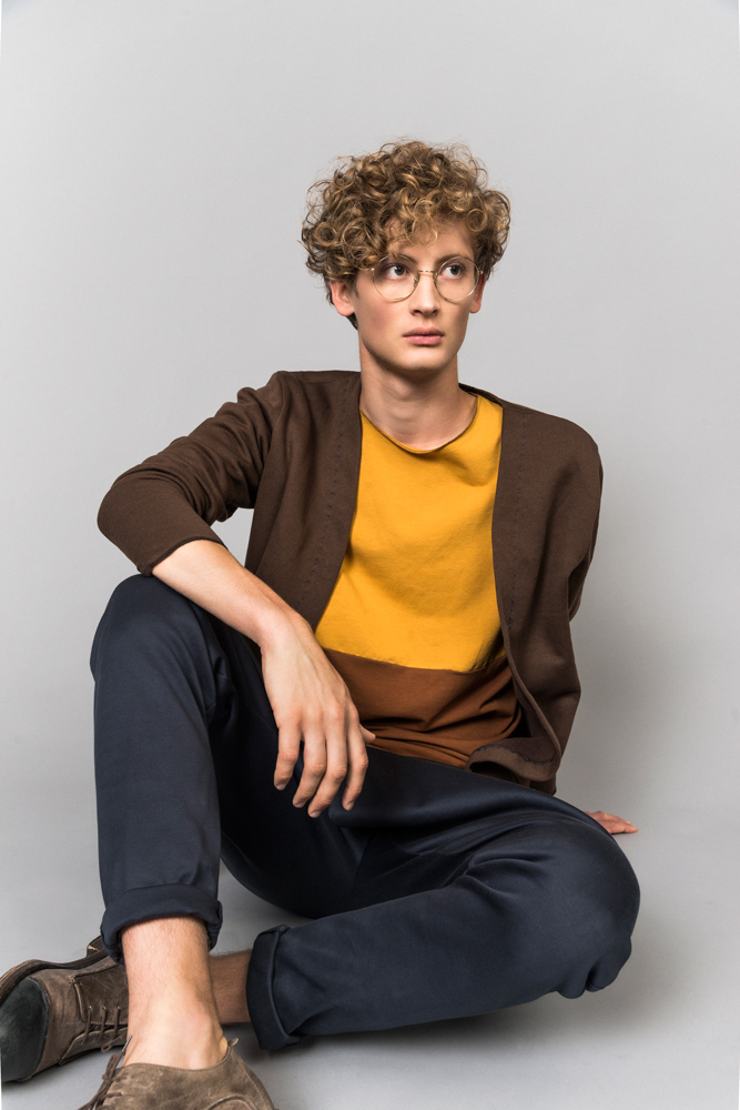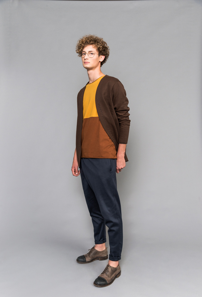 sustainable mens outfit blue, brown and ochre