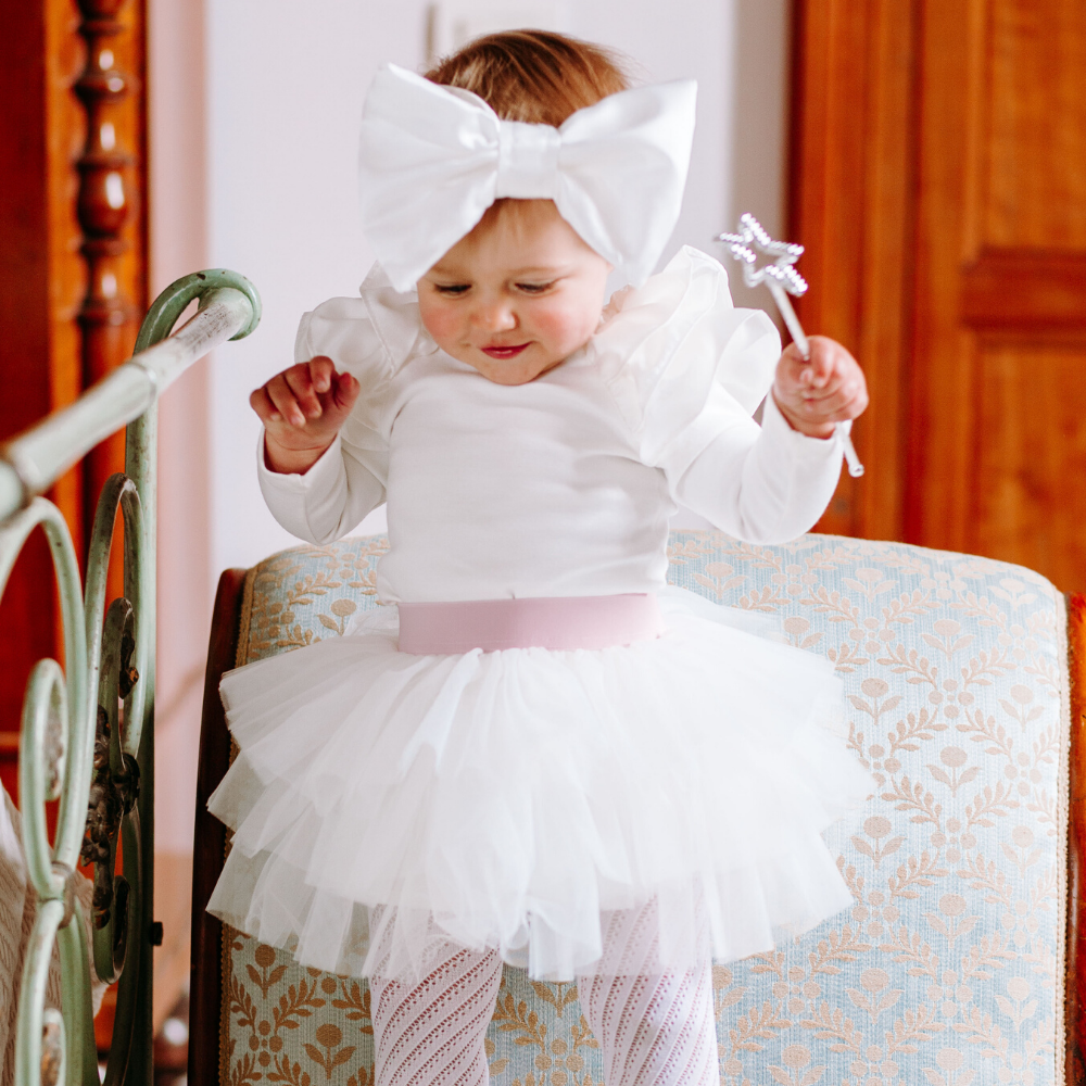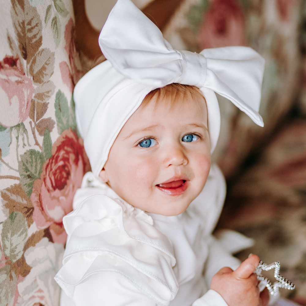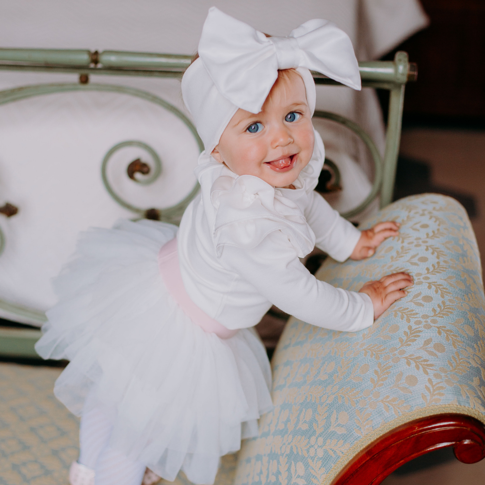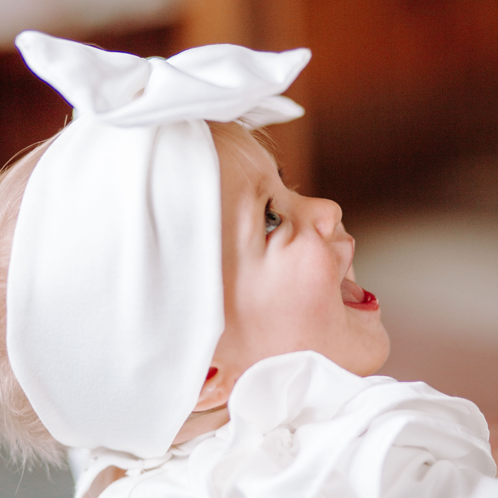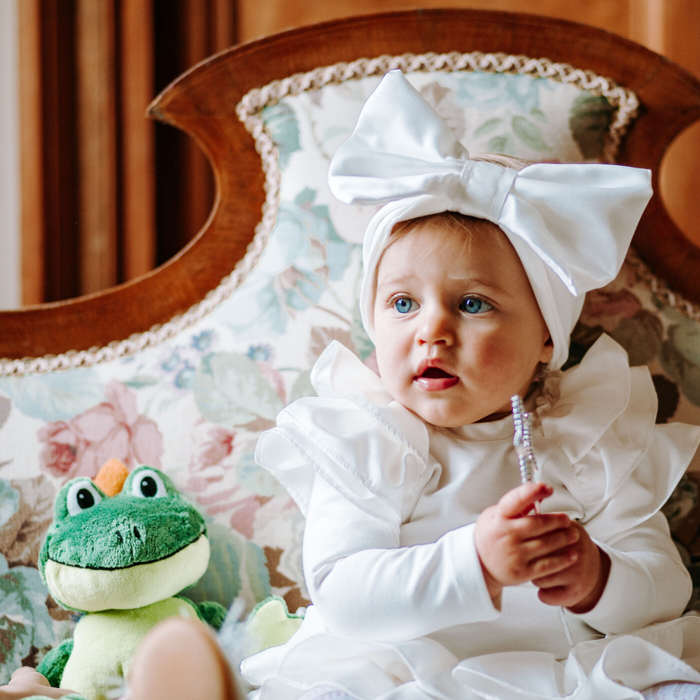 Fascia per capelli con enorme fiocco in raso bianco La fascia per capelli con enorme fiocco di color bianco รจ un accessorio per capelli bambina molto sfizioso, che piace alle bambine. La fascia รจ in cotone caldo e copre le orecchie delle tua bimba nelle giornate uggiose e il fiocco voluminoso arricchisse la fascia per capelli rendendola unica e straordinariamente vistosa. La fascia per capelli รจ disponibile in taglia unica, in quanto ha l’elastico che si adatta perfettamente alla circonferenza della testa della tua bambina. Abbina la fascia con la camicia body Emma in caldo cotoneย e la gonna Sofi…