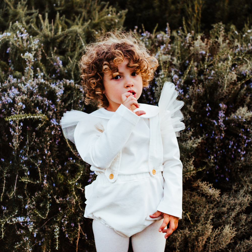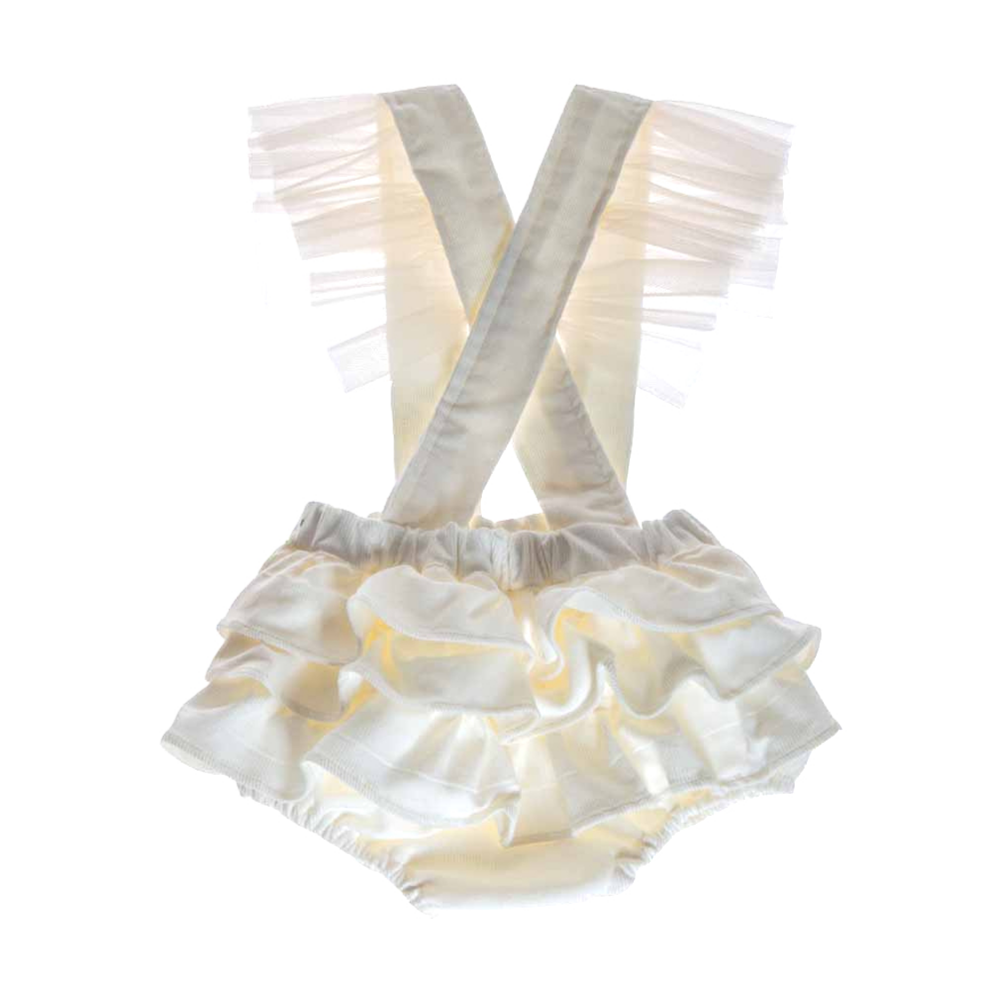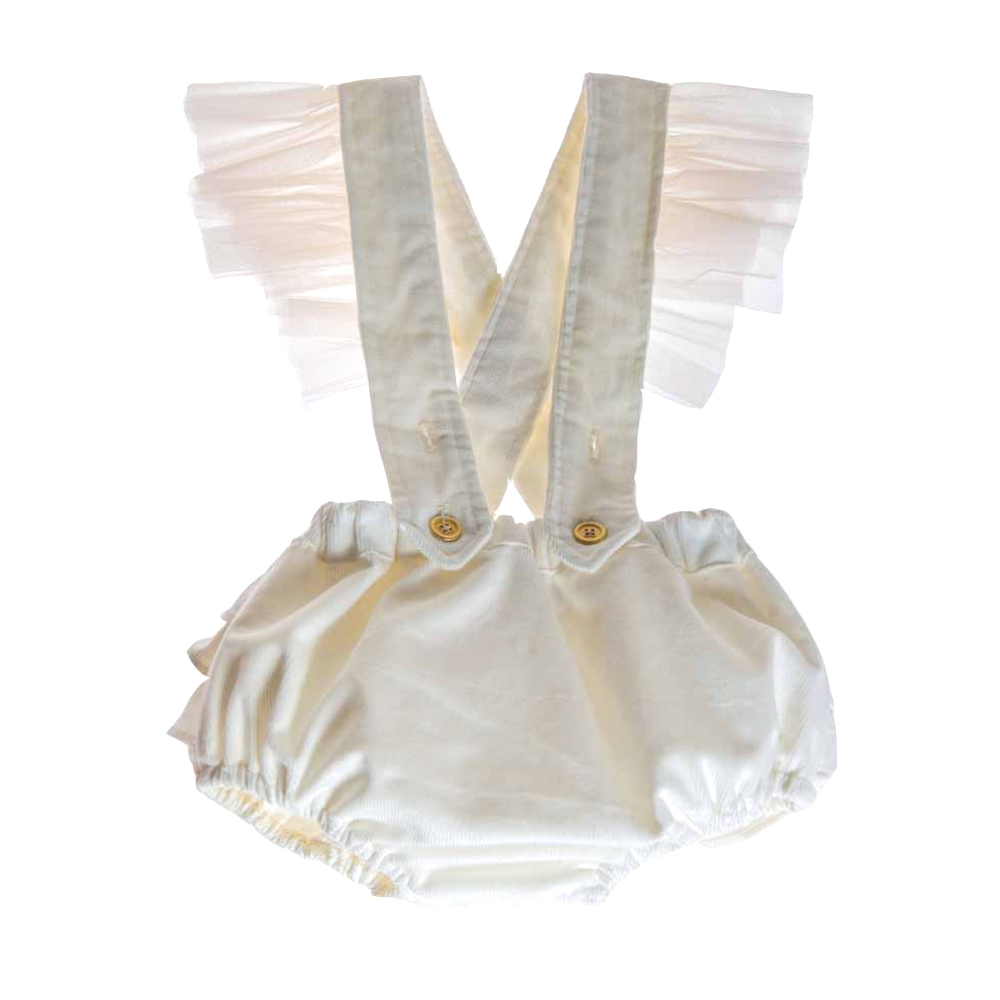 Salopette Mia elegante in velluto e tulle La salopette Mia in velluto e tulle da bambina è un capo di abbigliamento elegante, ideale per le cerimonie e i giorni di festa. La salopette da bambina ha le ruches voluminose sulla parte posteriore del pantalone e le bretelle hanno delle ali in tulle che rendono il capo voluminoso e prezioso. La salopette da bambina ha le bretelle regolabili che si allacciano con bottoni oro. Abbinala con la maglia Amore Mio per un look da bambina davvero chic e delicato. Dettagli salopette bambina in velluto e tulle lavare a mano composizione: 100…