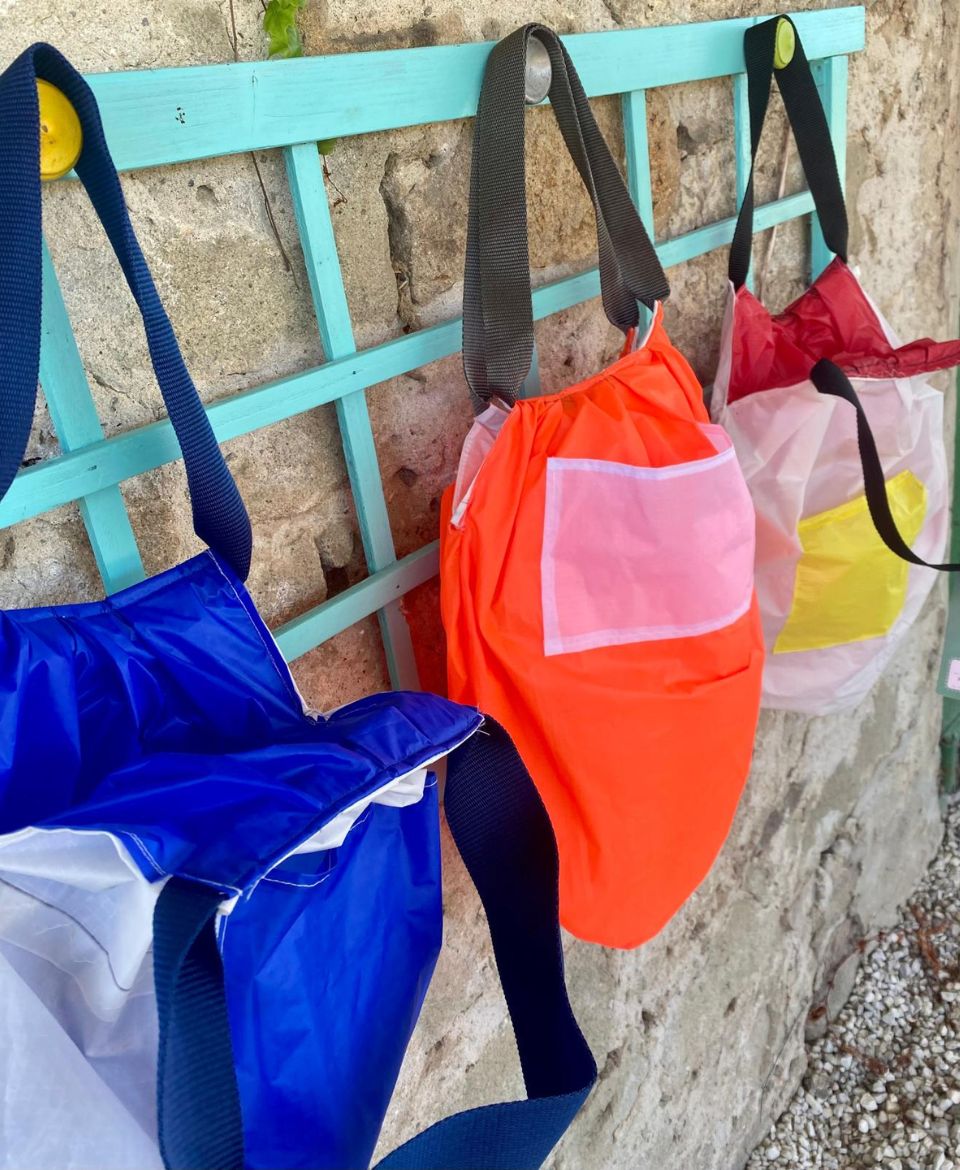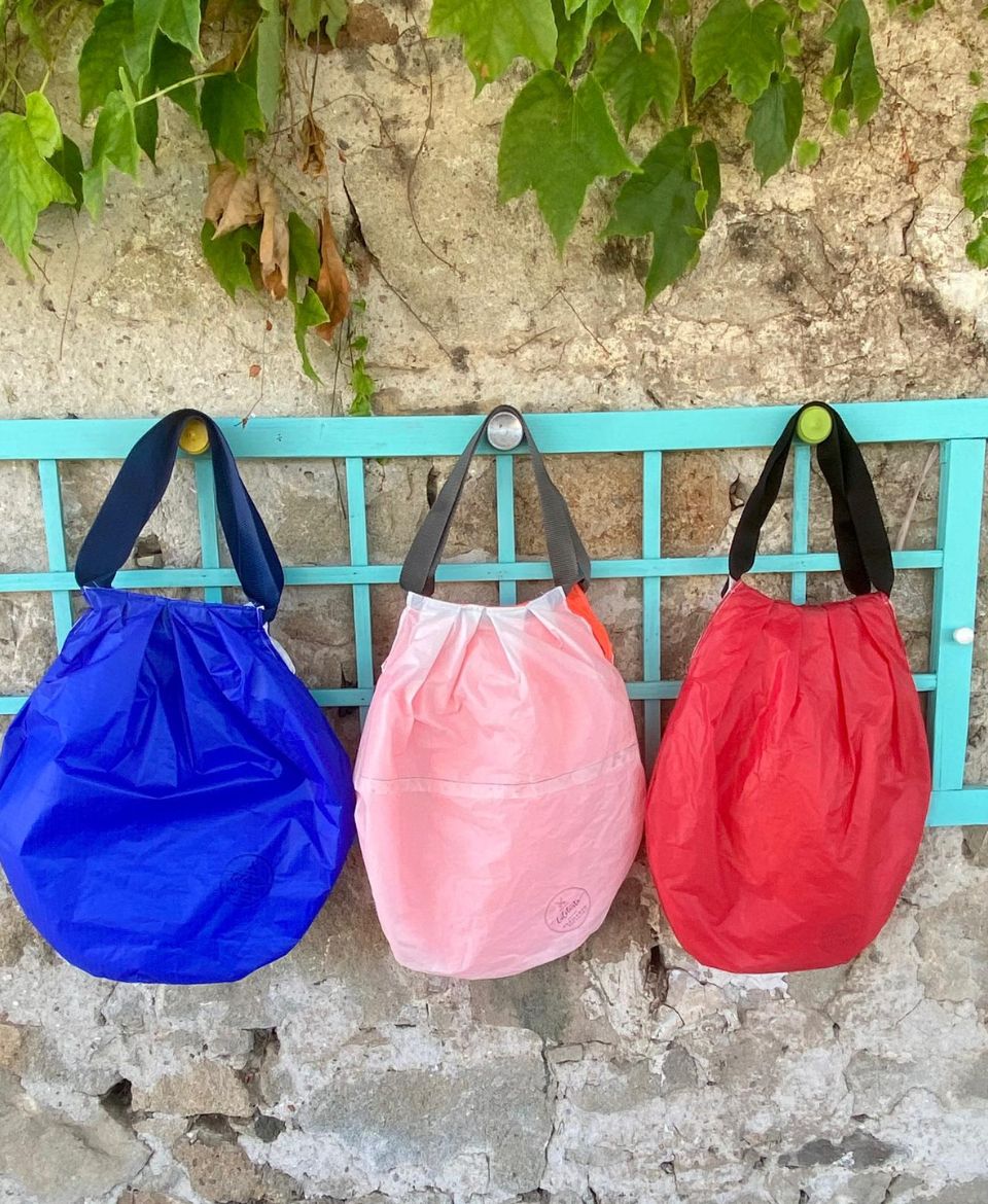 Materiali: tessuto da vela recuperato. Colori e combinazioni possono variare, rendendo ogni borsa unica.