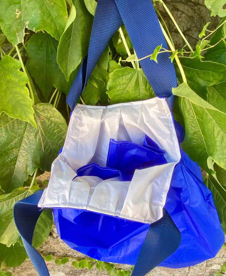 Questa borsa è realizzata a mano con tessuto da vela recuperato: leggerissimo, impermeabile, sorprendentemente resistente. È double face, perché ogni giorno può avere un colore diverso, un’umore nuovo, una sfumatura inaspettata.